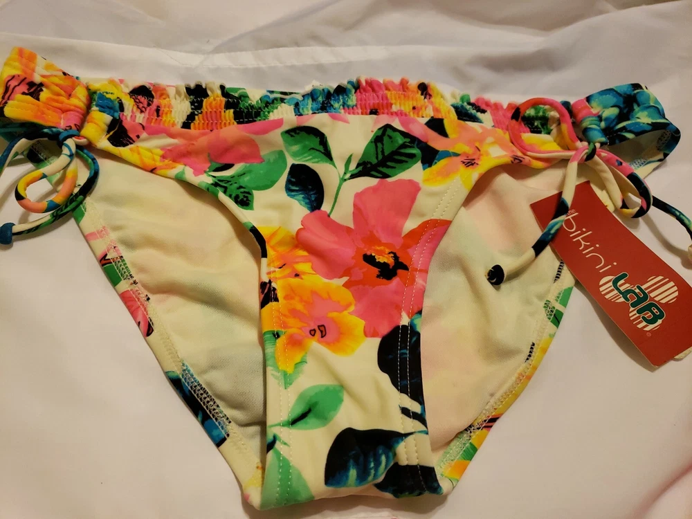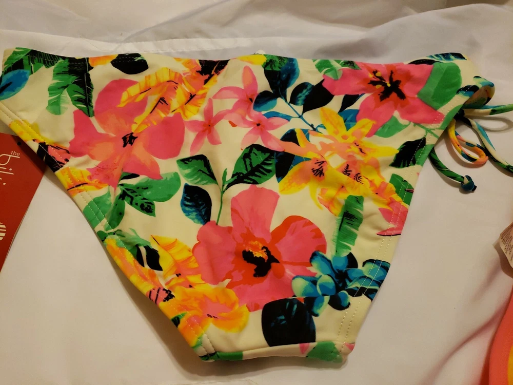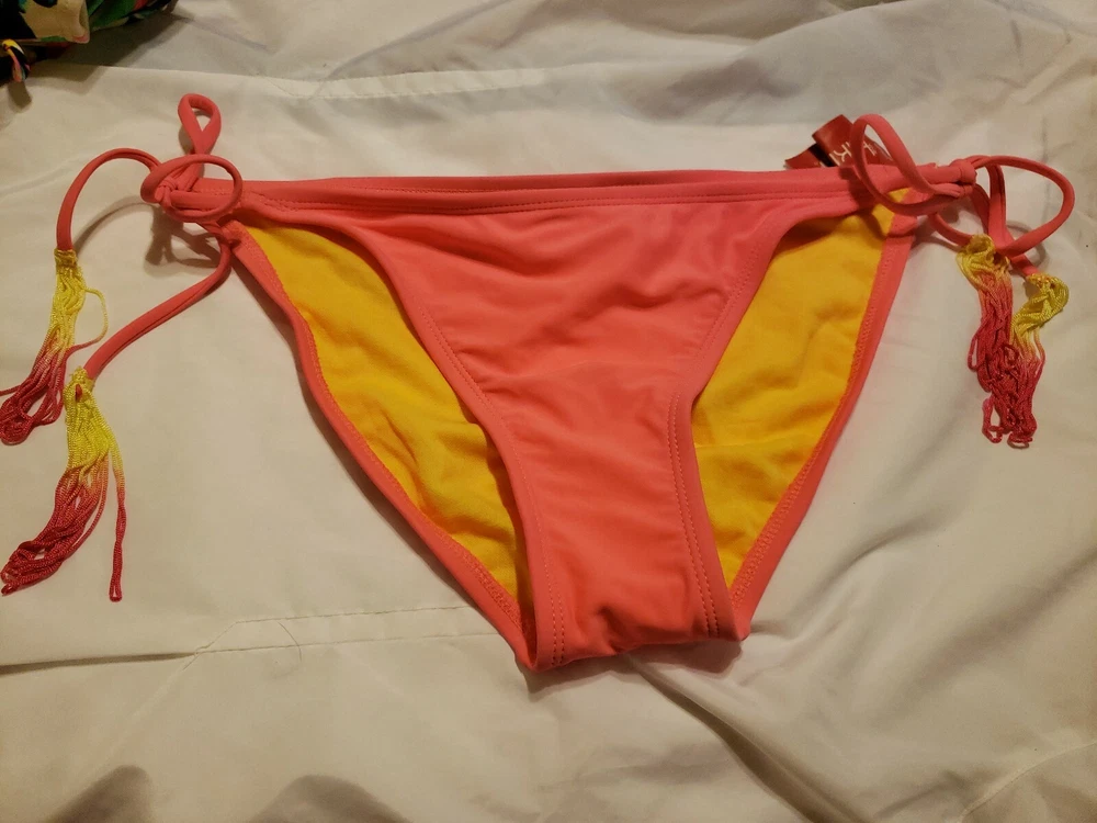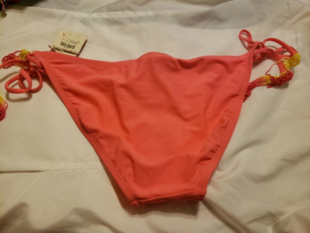 BRAND NEW with original tags attached. Macy's Solid pink string bikini bottoms with yellow lining and yellow to pink tassles. $38 Beautiful pink and yellow floral. Ruffled waistline. String accents on the sides. $40 Original Price $78 CLEARANCE - ONLY $23.50 And I pay for the shipping! Less than half price.