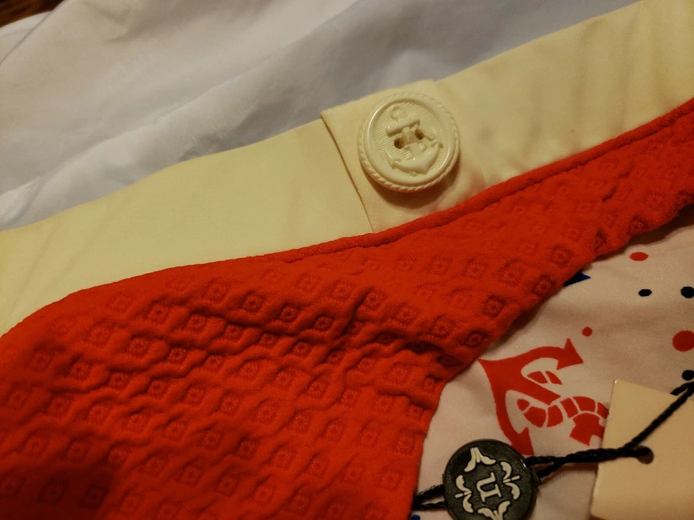 BRAND NEW with original tags attached. Macy's Nanette Lepore Textured Red with ivory contrast waistline. Adorned with nautical anchor buttons and anchor print on lining. Original Price $88 CLEARANCE - ONLY $23.50 And I pay for the shipping! Less than 1/3 of the price.