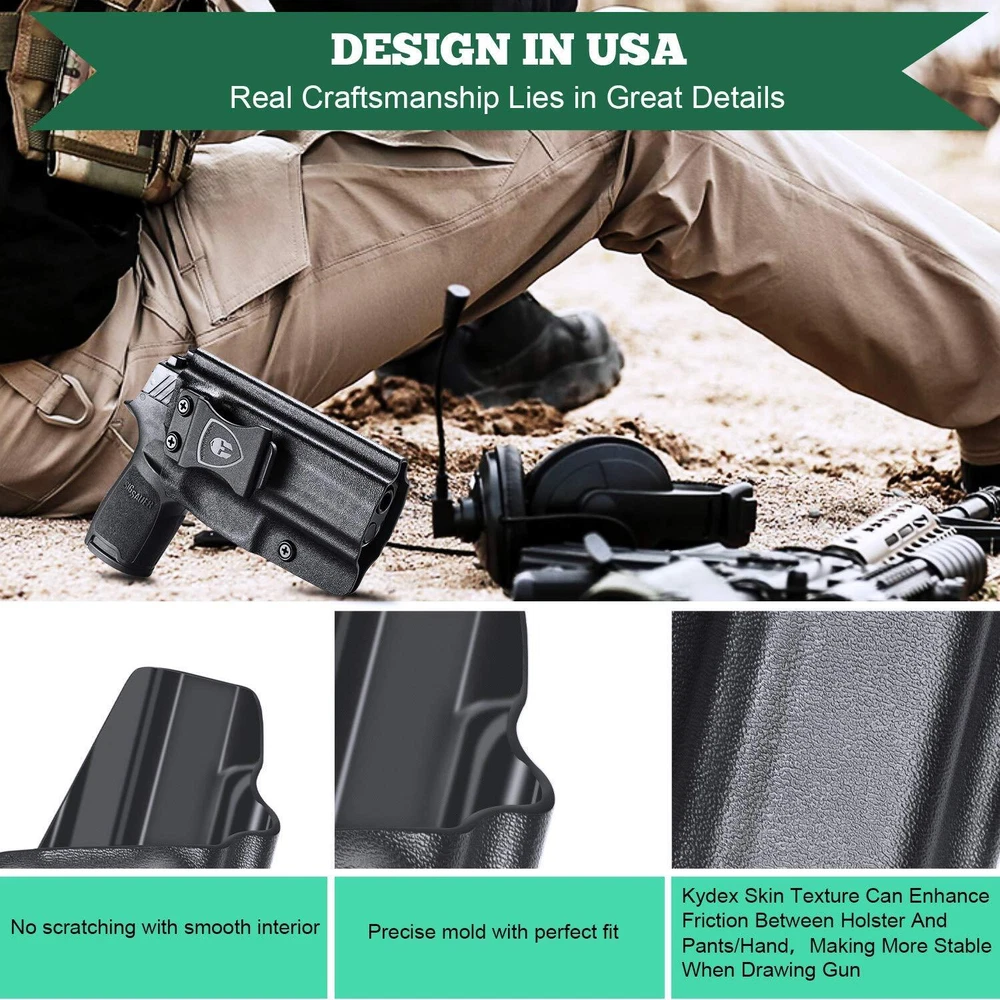 【Inside The Waistband Kydex Holster Fit】 .08'' US KYEDEX Custom for the Sig Sauer P320 Full Size, P320 Compact, P320 X-Carry pistols, both comfortable and durable. Inside waistband concealed carry holster, preserve your Sig P320 Full Size / Compact in perfect condition 【Full Cover Mag Button, No Scratch, No Jitter】 The holsters for Sig P320 Compact / Full Size full covering all access to the trigger, which can avoid all possible accidents. All edges are polished and smooth designed be exceptional consistency and accuracy. Smooth inside instructure can avoid scratching your love handgun. Full length sweat guard and rear sight shield to protect your weapon from sweat 【Adjustable 'Posi-CLICK' Retention, Fits Like A Glove】 All of our Holsters possess 'Posi-CLICK' Adjustable Audible Retention, you would hear a "CLICK" sound when your pistol is securely holstered 【1.5’’ Belt Fit Perfect】 Sig P320 Holsters belt clip is suitable for 1.5’’ belt, with hook in buttom, it stick firmly in your belt while drawing and holding 【Adjustable Cant】 The Carry Angle (Cant) can adjust from -5° to 20°, use phillips screwdriver to customize the CANT to meet your need, super easy for Appendix Carry, Hip Carry (3/9 O'Clock), Back Carry (6 O'Clock) 【Adjustable Retention Pressure】 Retension tightness is also adjustable, use Phillips Screwdriver to reach your ideal retention pressure 【Lifetime Warranty】 We offer a lifetime warranty, if for any reason you are unsatisfied, please feel free to contact our 24/7 Customer Services, we stand behind the quality of our work! 【Please Noted】 We have Left Hand Draw(IWB) and Right Hand Draw(IWB) Options, Choose Left Hand Draw(IWB) you will get holster for left hand draw, Choose Right Hand Draw(IWB) you will get holster for right hand draw. If you can't find, it means that (right or left) out of stock and will come back soon.