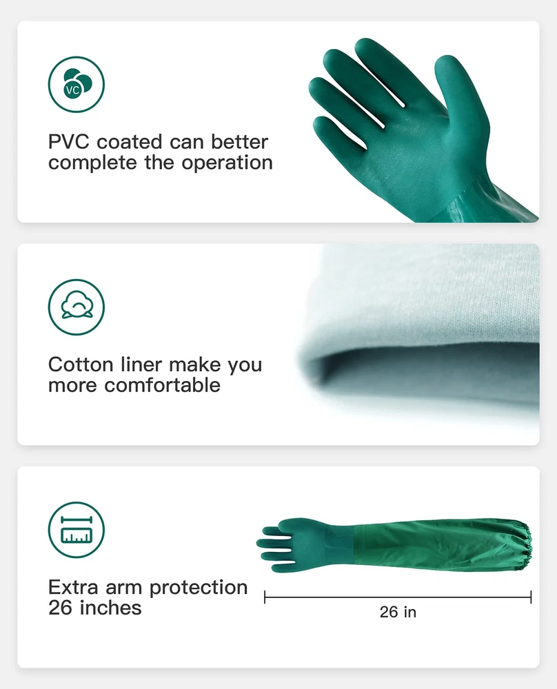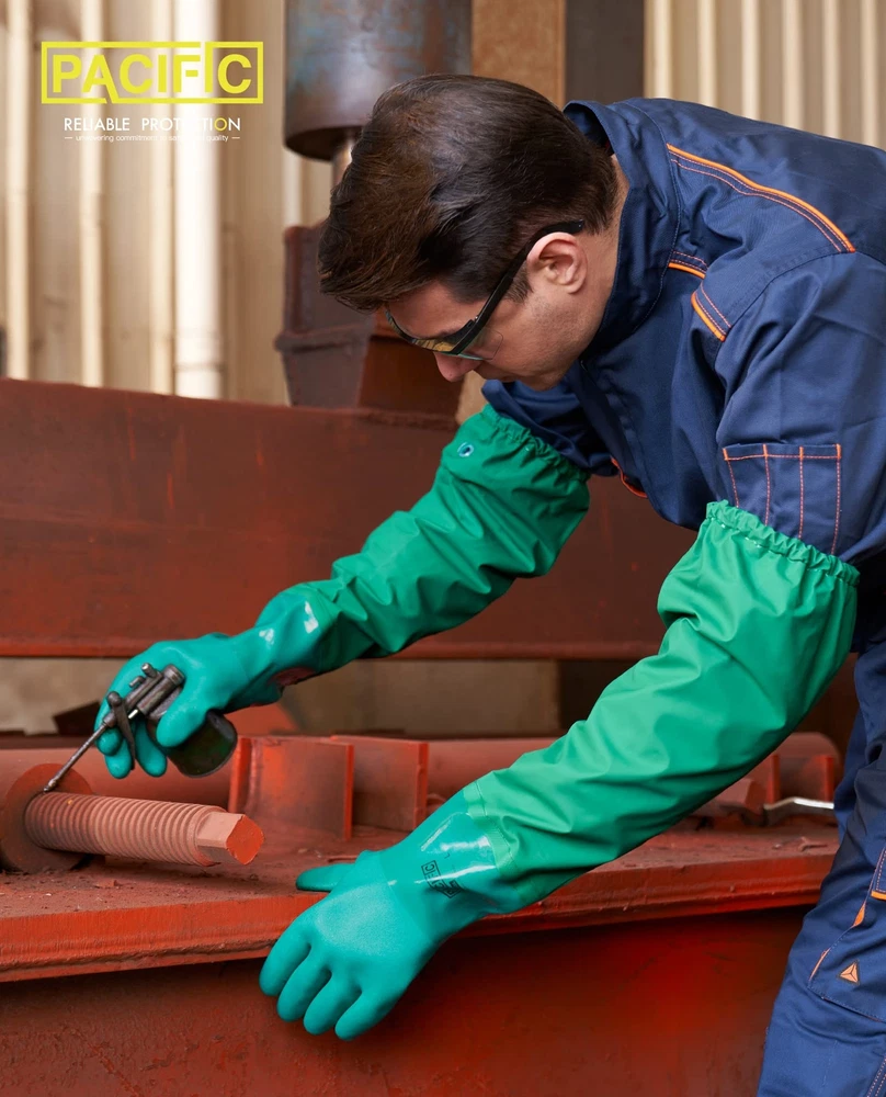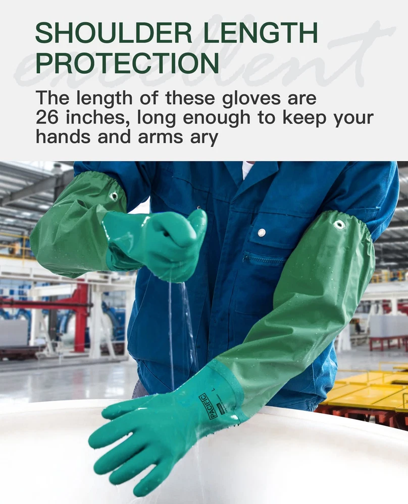 COLOR: Green LENGTH: 26 INCH Attention: 1. Do not touch for high-concentration chemicals. 2. Do not use work gloves as heat resistance protection. 3. Do not wear sharp ornaments like the diamond ring and other jewelry in case of a scratch. 4. Keep away from sharp items like needles and toothpicks in case of a puncture. Maintenance & Cleanup 1. The gloves can be hand washed with neutral detergent and running water. If machine washed, please do not put them into the dryer, just air dried. 2. The PVC gloves should be stored in a dry and dark place to help extend its lifespan. Pacific PPE Oil Resistant Gloves Pacific PPE oil resistant glove,pure seamless cotton liner, close to human skin, is very soft and comfortable for use. Sandy-texture palm offers a strong grip and high resistance to abrasion, mechanical risks, gas & oil, and other chemical risks. ๐๐ฑ๐๐๐ฅ๐ฅ๐๐ง๐ญ ๐๐ก๐๐ฆ๐ข๐๐๐ฅ ๐๐๐ฌ๐ข๐ฌ๐ญ๐๐ง๐๐: The ergonomically shaped reusable work gloves are made of PVC, offer high resistance to chemicals, alkali, solvent, and mechanical risks, also can be used a long time at work no fracturing, become hard, oil impregnate and more. And our reusable long rubber gloves are anti-aging and the mechanical strength can be maintained above 90% under continuous operation for 96 hours at 158 degree Fahrenheit. ๐ ๐ฅ๐๐ฑ๐ข๐๐ข๐ฅ๐ข๐ญ๐ฒ & ๐๐จ๐ฆ๐๐จ๐ซ๐ญ๐๐๐ฅ๐: With 13 gauge seamless cotton liner, these heavy duty chemical resistant gloves are breathable, easy to pull on and off. You will be able to wear these chemical resistant gloves for long periods of time without discomfort. The amazing flexibility of these extra long sleeve 26 inches gloves are the most notable feature, provide effective barrier protection for wrist and arm from splashes, abrasives and dangerous chemicals. ๐๐ญ๐ซ๐จ๐ง๐ , ๐๐ฎ๐ฉ๐๐ซ๐ข๐จ๐ซ ๐๐ซ๐ข๐ฉ: The non-slip sandy textured palm chemical resistant gloves offer good grip to grab the wet and greasy parts. They meet the highest level 4 (at least 8000 cycles) of abrasion resistance, level 1 (1.2 index) of blade resistance, level 2 (25 newton) of tear resistance and level 1 (20 newton) of puncture resistance. ๐๐ฎ๐ฅ๐ญ๐ข๐ฉ๐ฎ๐ซ๐ฉ๐จ๐ฌ๐: The rubber work gloves are latex free, better solutions for people with sensitive skin. They are ideal for handling chemicals, petrochemical and oil refining, mechanical manufacturing, mining, agriculture, farm, gardening, construction, automotive industry, forestry and more. ๐๐๐ฅ๐ข๐๐๐ฅ๐ ๐๐ซ๐จ๐ญ๐๐๐ญ๐ข๐จ๐ง: This chemical gloves are compliant with Intertek and meet CA Prop.65 regulations for phthalates.