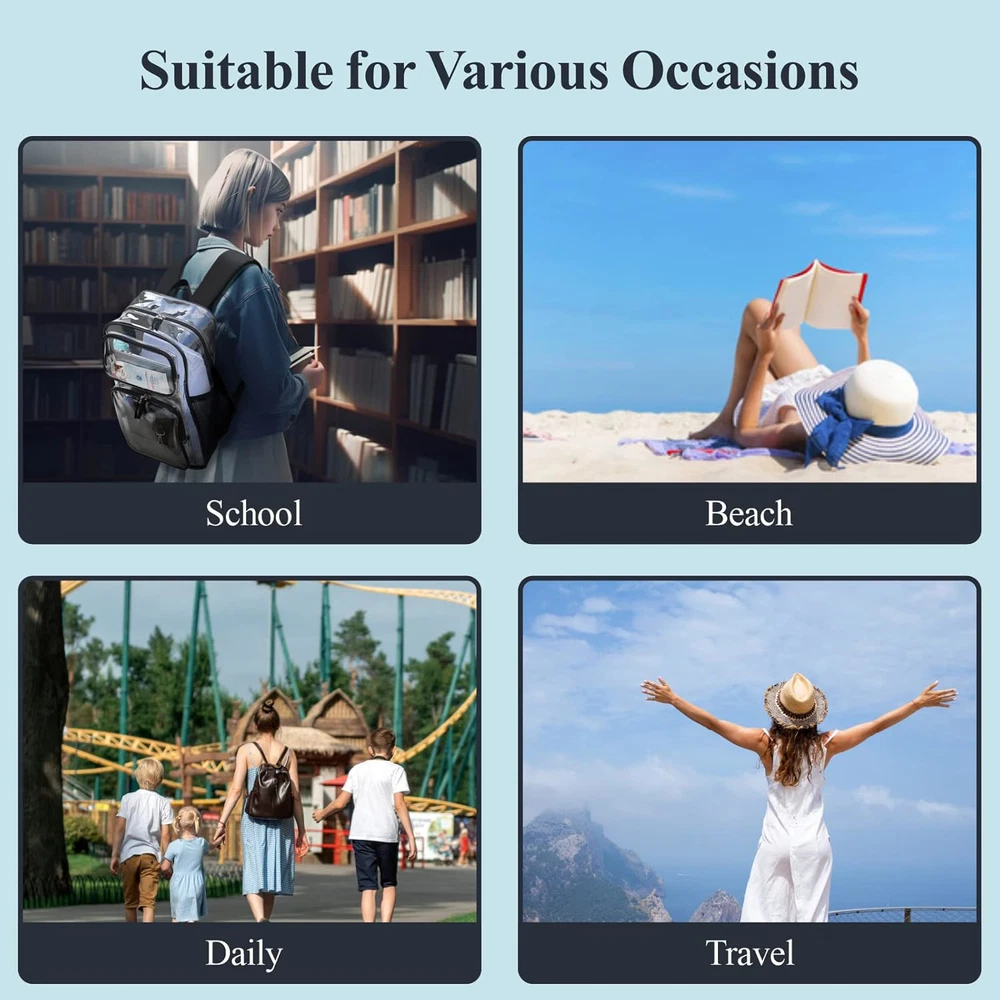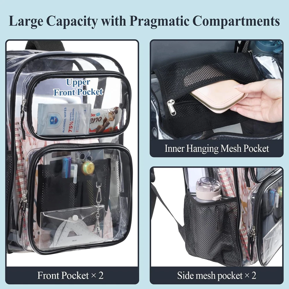 PACKISM Clear Backpack for School - 17 inch Large Heavy Duty Clear Bookbag for 2 Compliant with Back to School Clear Bag Policy: The clear design of this clear backpacks for school allows for easy inspection of contents, making it perfect for school security checks. Breeze through checkpoints and quickly locate your items without rummaging through the bag, saving you time and hassle. Built to Last: This heavy duty clear backpack is crafted from thick, high-quality PVC material with reinforced stitching, sturdy zippers, and a reinforced fabric bottom. Its durable construction withstands daily wear and tear, saving you from frequent replacements and providing long-lasting use. Spacious and Organized: With a large main compartment, 2 front pockets, and 2 side mesh pouches, this large clear backpack offers ample space to hold binders, laptops, books, notepads, pens, and water bottles. It keeps all your school essentials neatly organized and easily accessible. Comfortable All-Day Wear: Designed with thick, padded shoulder straps that are ergonomically shaped, this clear book bag is perfect for students aged 12 and above. The comfortable straps reduce shoulder strain, allowing you to carry your belongings all day without discomfort, even when fully loaded. Versatile for Multiple Uses: This stylish and functional clear plastic backpack is suitable for men, women, and students in various settings, including school, work, and travel. It provides ample space for all your essentials, eliminating the need for multiple bags and offering great convenience.