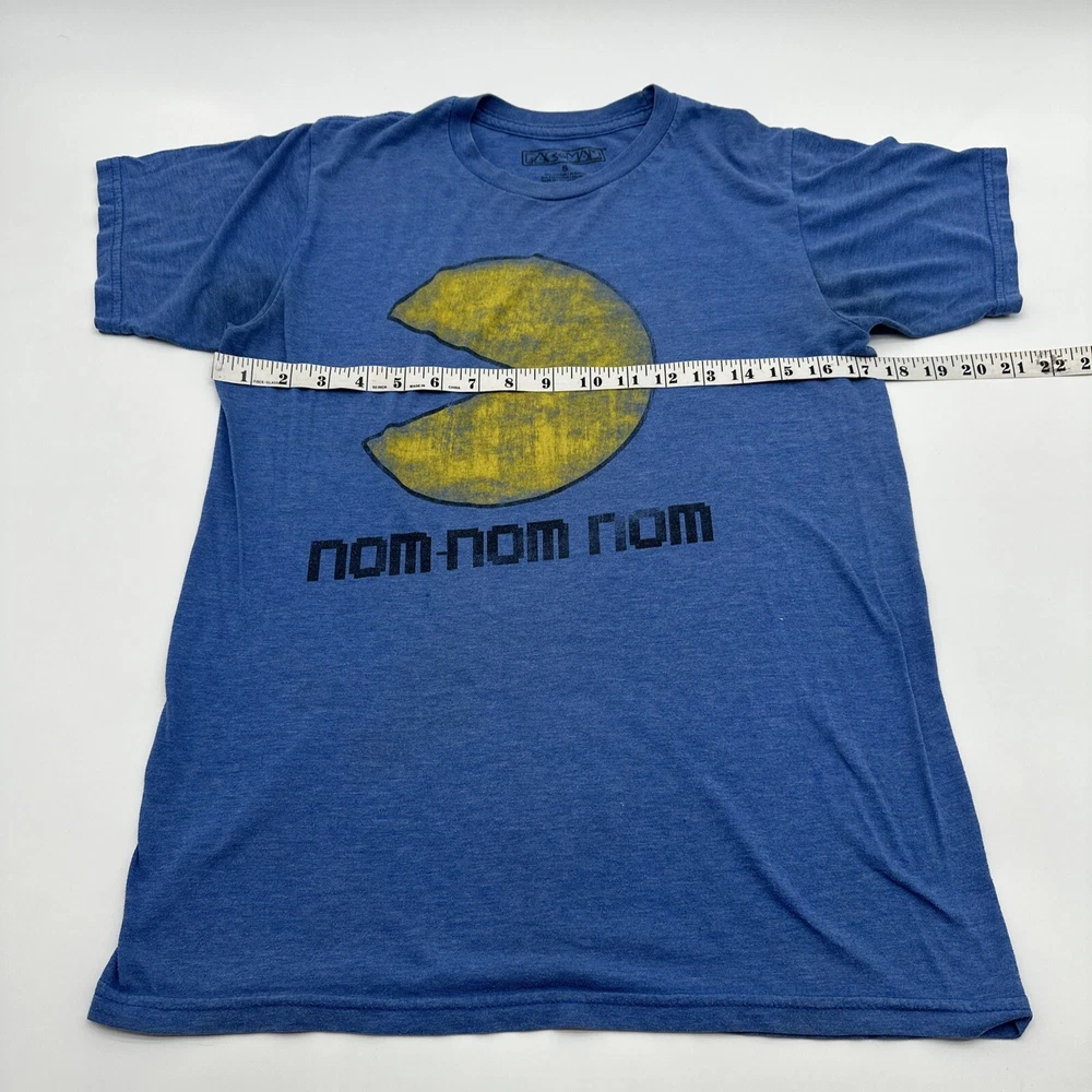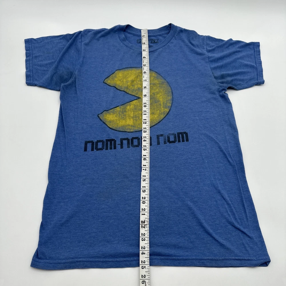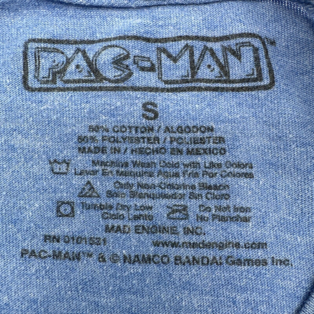 Show off your love for the classic video game character with this blue graphic print PAC-Man T-shirt. Featuring a crew neck and short sleeves, this regular fit tee is made from a comfortable blend of polyester and cotton. The shirt is accented with the iconic PAC-Man logo and is perfect for all seasons. This men's T-shirt is available in size small and is made in Mexico. Whether you're a fan of the game or just love the retro style, this shirt is a must-have for any Pac-Man enthusiast. Add it to your collection today! Check pictures for flaws and measurements