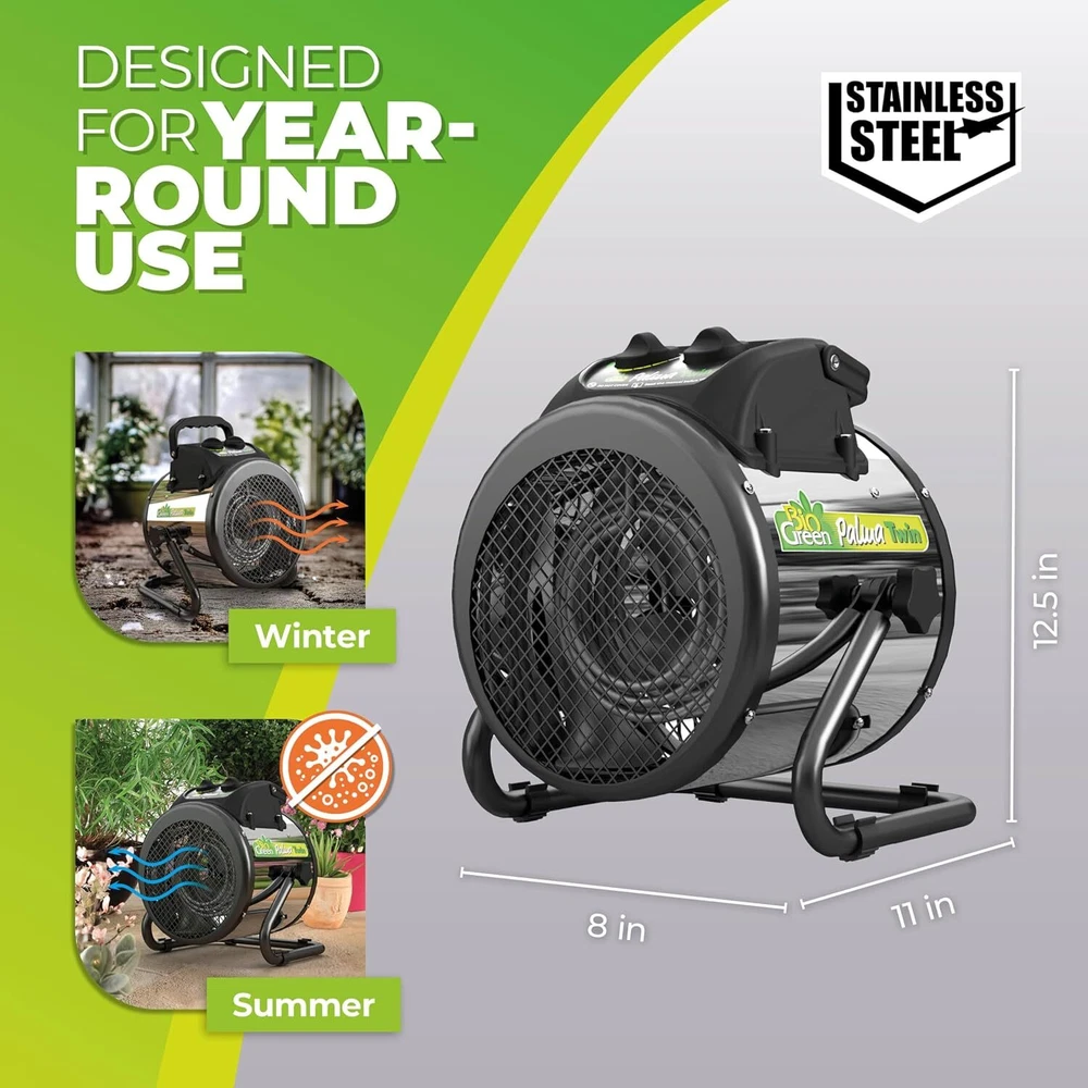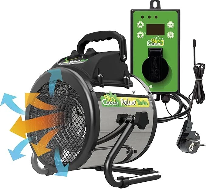 PAL 2.0/USDT Palma Greenhouse Heater with Thermostat - Fast Heating, Grow Tent Heater, Greenhouse Fan, Outdoor Heater & Electric Garage Warmer - 11”x 8”x12.5" - 110v Heater TWO SEPARATELY ADJUSTABLE HEATING ELEMENTS: 750 watts or 1500 watts power. The heater is ideal for rooms up to 120 ft² with an average height of 6.6 feet. PRECISE TEMPERATURE CONTROL: The thermostat automatically starts and stops the heater when the desired temperature is reached. The temperature range is from 32°F to185°F. AIR CIRCULATION MODE: Activating the air circulation mode turns the heater into a fan. The air movement prevents heat buildup around plants. QUICK AND EVEN AIR CIRCULATION: The air circulation heater is very efficient and easily circulates up to 5800 ft³ of air per hour. Since the heater does not run as long, you save electricity and money. SPLASH-PROOF ACCORDING TO IPX4: Thanks to splash protection, the heater can be safely and reliably used in damp rooms. It can also withstand rain and irrigation water without any problems.