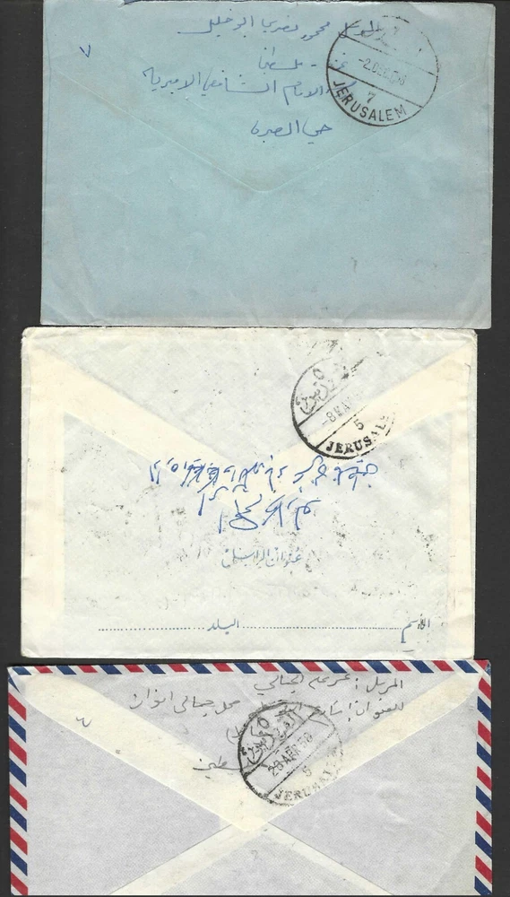 PALESTINE GAZA EGYPT 1958 THREE GAZA CITY COVERS TO JERUSALEM JORDAN PLEASE VISIT MY EBAY STORE : Filatco Stamps BUY 5 ITEMS SHIPPING & REGISTRATION IS FREE INTERNATIONAL BUYERS PLEASE NOTE: EBAY AND PAYPAL REQUIRE REGISTRATION FOR TRACKING INTERNATIONAL SHIPMENTS. EBAY CHARGES $12.61 FOR SHIPPING LABELS WITH TRAKING # US POST OFFICE CHARGES $14.95 FOR REGISTRATION # + POSTAGE BUYER HAS THE CHOICE OF SHIPPING FIRST CLASS MAIL WITHOUT TRACKING # FOR $2.50 . IN THIS CASE BUYER ACCEPTS RESPONSIBILITY IF ITEM IS LOST IN TRANSIT. Feel free to ask if you have any questions. PAYMENT WITHIN 2 DAYS IS APPRECIATED . FEEDBACK : I APPRECIATE YOUR BUSINESS AND MY TOP CONCERN IS TO MAKE SURE YOU ARE 100% PLEASED WITH ANY ITEM YOU PURCHASE. IF YOU HAVE A CONCERN OR A PROBLEM WITH INVOICE, SHIPPING OR ANY ITEM YOU RECEIVED PLEASE CONTACT ME FIRST BEFORE YOU LEAVE ANY FEEDBACK. I GUARANTEE YOU WILL BE 100% SATISFIED WITH THE TRANSACTION. I WILL CERTAINLY LEAVE YOU A POSITIVE FEEDBACK AS SOON AS I RECEIVE YOURS.