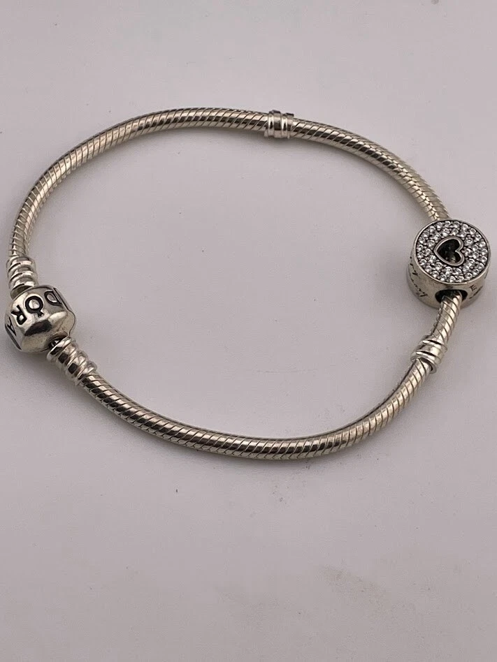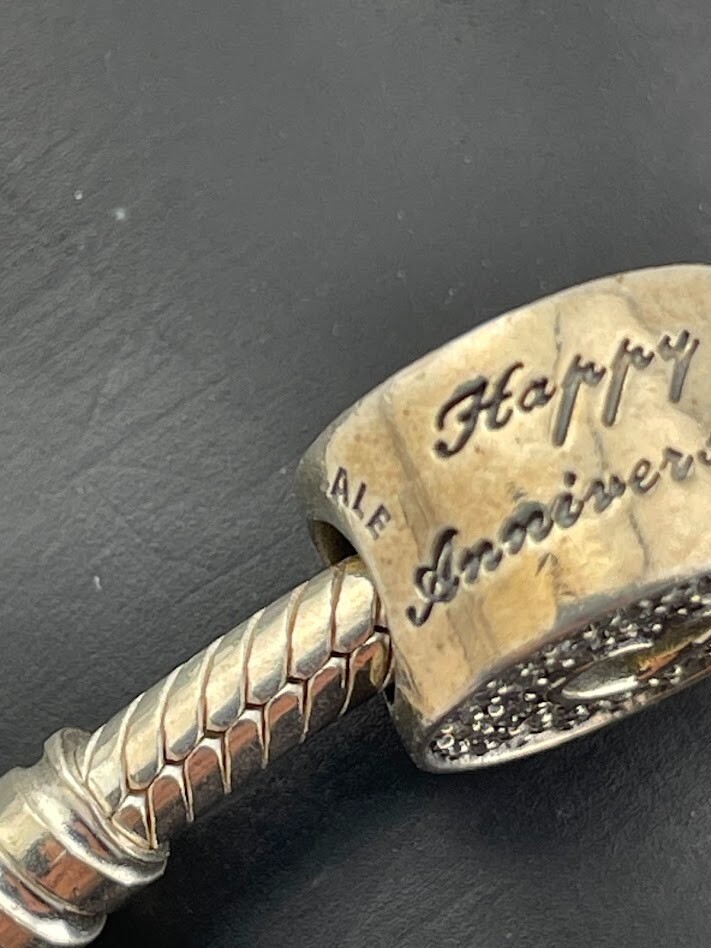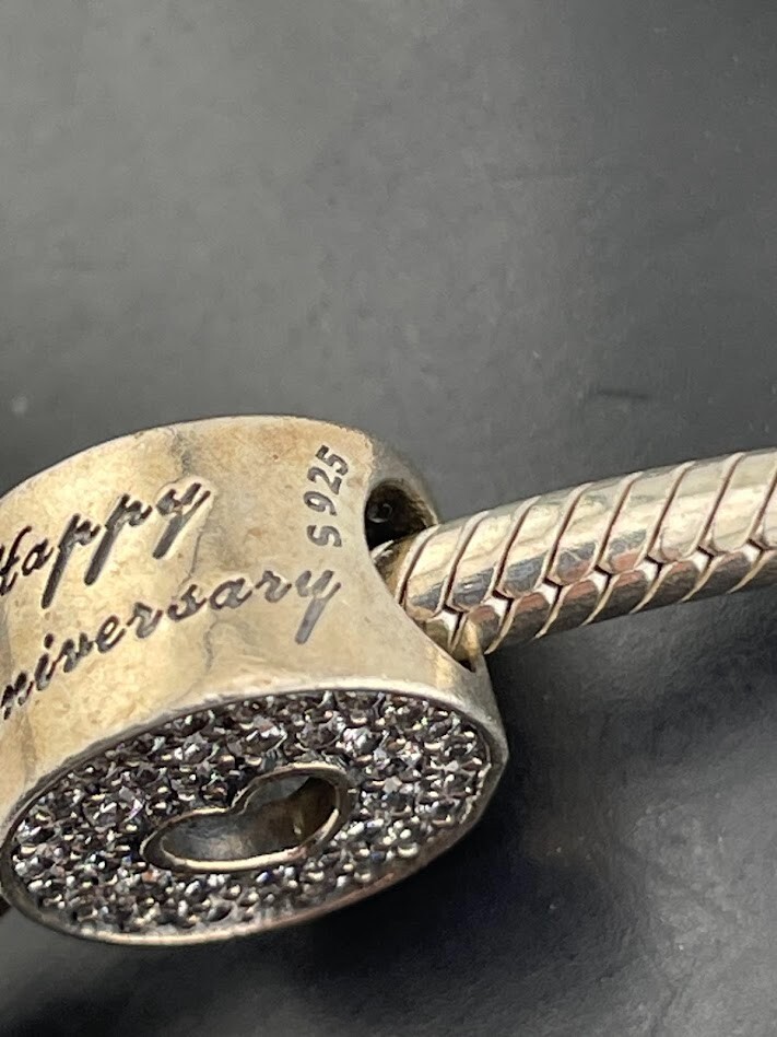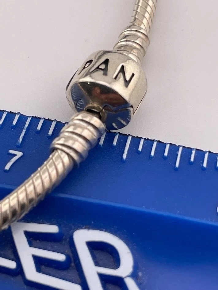 PANDORA 925 STERLING SILVER SNAKE CHAIN BRACELET W/ANNIVERSARY CHARM 7.5" 4085 LOVE ****************************** Thank you for your interest in our jewelry. We?d like to introduce ourselves. We are just a retired couple who love matching our customers with great jewelry. We?re not professional jewelers. To have the best shopping experience we like to recommend the following: Please measure your hand, wrist, finger or neck to ensure the best fit. We can use your measurements to help with sizing. Please ask all the questions you want. We know some stuff and, if we don?t, we?ll do the research. We like to learn too. More Stuff: If an item is described as ?gold over 925 sterling silver? this means it is gold vermeil. Vermeil is the process by which a layer of gold (usually 14k or 18k) is bonded to sterling silver. We only clean with gentle soap and warm water to avoid damage. The items we sell may be new or pre-owned and may have normal wear, slight damage, and/or tarnish. We make every effort to ensure the items we sell are as described. This includes testing to confirm metal purity if the item isn?t marked, and testing for gemstone identity. We try to put measurements in the jewelry description and include a photo of each piece with a U.S. quarter (25mm).