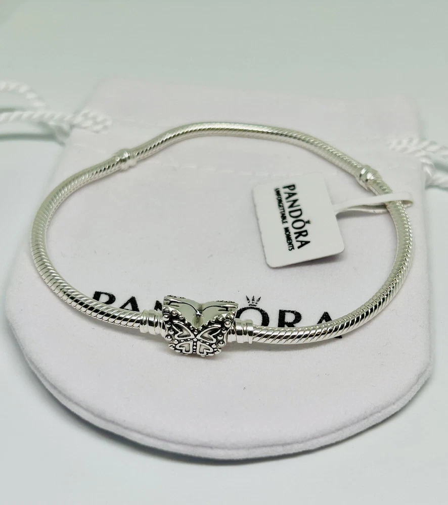 Elevate your jewelry collection with the elegant PANDORA Moments Butterfly Clasp Snake Chain Bracelet. Crafted from high-quality sterling silver and featuring a unique butterfly clasp, this bracelet is a versatile piece that complements any outfit. The clear cubic zirconia accents add a subtle sparkle, while the durable snake chain design ensures a comfortable fit and effortless style. Ideal for a range of special occasions from birthdays to weddings, this bracelet is a timeless gift or a cherished treat for yourself. The thoughtful design details, including the S925 ALE metal purity stamp and Thai craftsmanship, ensure that you're adding a piece that's both beautiful and built to last. Pictures are a big part of the listing, please look at all of them.