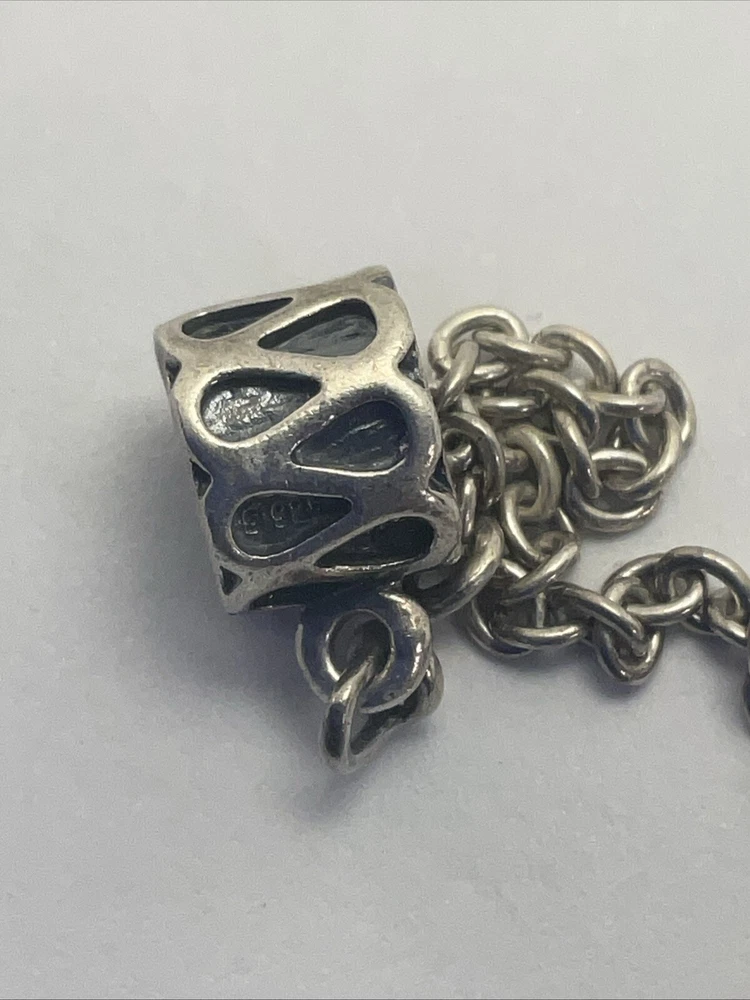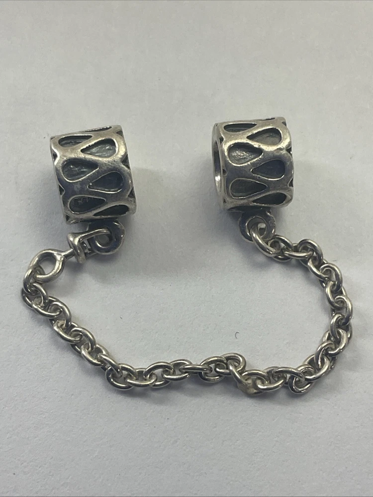 This is a PANDORA Retired Sterling Silver S 925 ALE Raindrops Bracelet Safety Chain. It is a dangle charm made from 925 sterling silver and features a raindrop design. This charm is designed to be used as a safety chain for a PANDORA bracelet to ensure that the bracelet stays securely on the wrist. The charm does not contain any main stones and is a stylish accessory for any PANDORA charm bracelet.