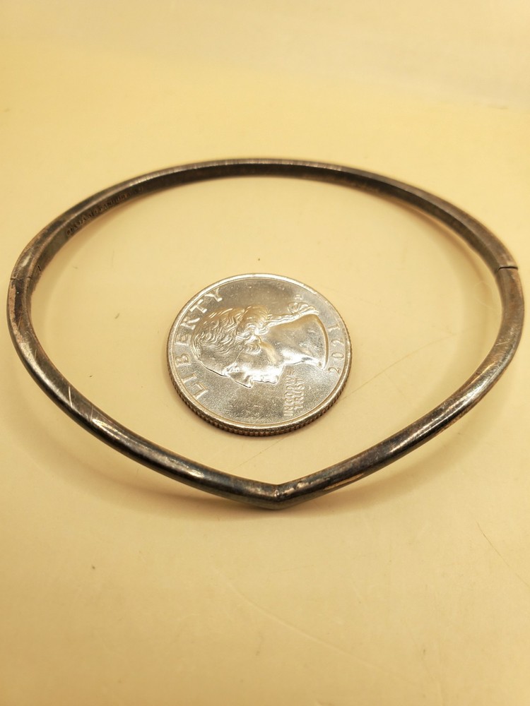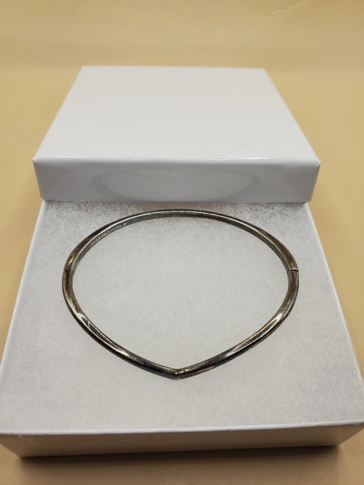 This sterling silver PANDORA bracelet is a must-have for any jewelry lover. The inside of bracelet is signed B1 S 925 ALE PANDORA, ensuring its authenticity. The bracelet weighs 11.1 grams and is 2.6mm wide. There is patina on the silver due to age, which adds a touch of vintage charm. I have not attempted to clean or polish the outside of bracelet, I leave that decision uo to the buyer. I did use a silver polishing cloth on inside of bracelet where signature is so I could read it better. That area did shine up nicely. The 2nd to last photo shows the signature prior to polishing and last photo is after polishing signature area. The hinged closure with latch ensures that this bracelet will stay securely on your wrist. The latch is on underside of bracelet and works well. The PANDORA brand is well-known for their high-quality jewelry pieces. Please see all photos.