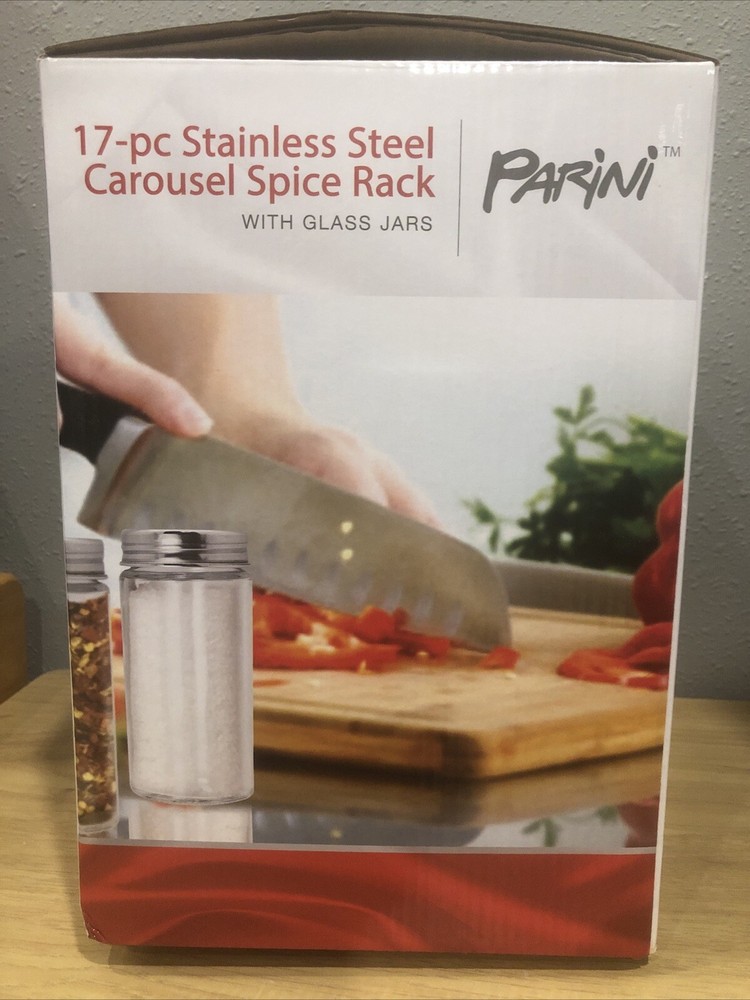 This is a Parini carousel spice rack with 16 glass jars, made of stainless steel. It has a round shape with a rotating base for easy access. The rack is free-standing and features a stainless steel finish. The dimensions are 8 inches in length, 8 inches in width, and 11 inches in height, weighing 7 lbs. It is brand new and perfect for organizing spices in the kitchen.