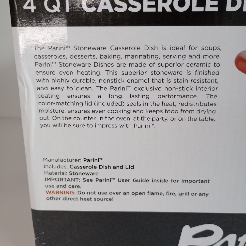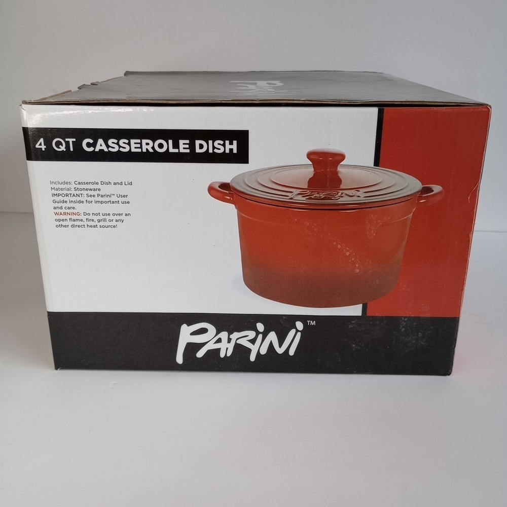 The PARINI 2 QT. FLAMEPROOF CASSEROLE Dish with Lid is a vibrant orange ceramic casserole that is compatible with electric and gas stoves. This 2-quart dish features a flat-bottomed design, double handles, and comes with a matching lid for easy storage. The dishwasher-safe surface coating ensures easy cleaning, making it a practical and stylish addition to any kitchen. The PARINI brand is known for quality cookware, and this casserole is no exception.