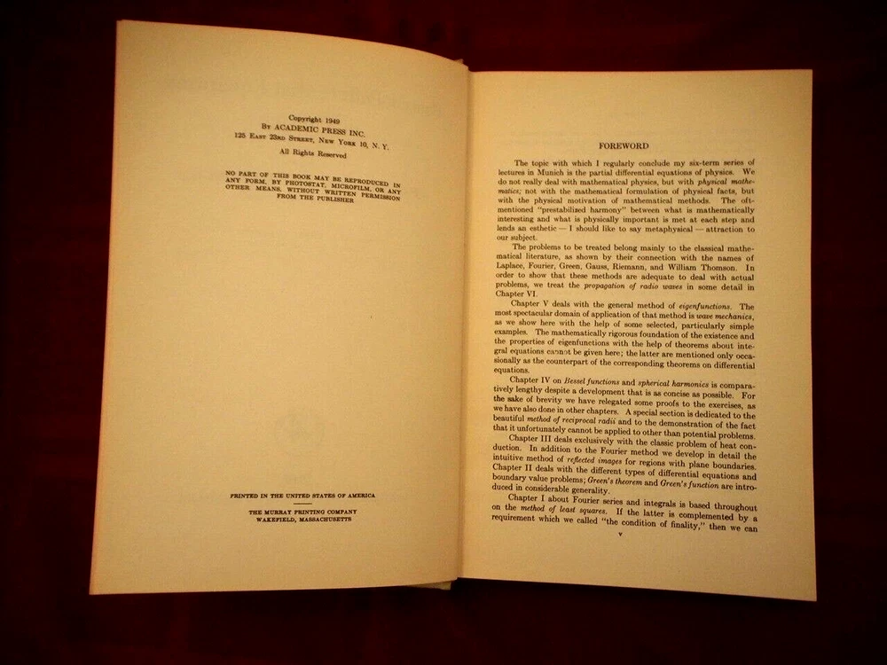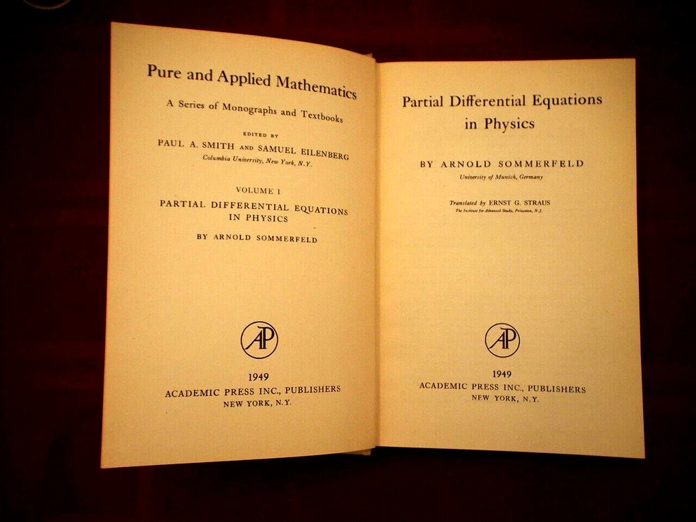This hardback book titled "Partial Differential Equations in Physics" by Arnold Sommerfeld is a rare find for any physics enthusiast. Published by Academic Press in 1949, this first edition book covers important topics in physics such as nonfiction narrative type, pure and applied mathematics publisher, and physics genre. Measuring 9 inches in length, 6.5 inches in width, and 1.5 inches in height, this book weighs 20 oz and contains 335 pages. It is written in English and intended for adult readers. This vintage book is a must-have for any collector or physicist looking to expand their knowledge.