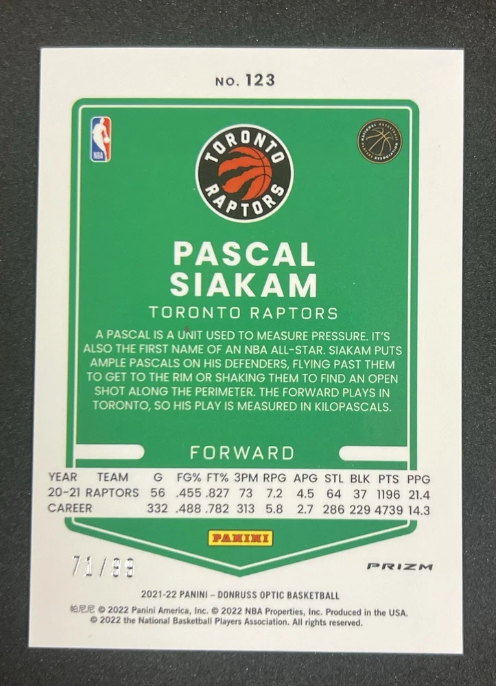 Season: 2021-22 Original/Licensed Reprint: Original Year Manufactured: 2022 Manufacturer: Panini Card Thickness: 35 Pt. Features: Parallel/Variety, Serial Numbered, Short Print Set: 2021-22 Panini Donruss Optic Print Run: 99 Card Size: Standard Card Number: 123 Parallel/Variety: Red Autographed: No Team: Toronto Raptors Player/Athlete: Pascal Siakam Language: English League: National Basketball Association (NBA) Sport: Basketball Vintage: No Type: Sports Trading Card