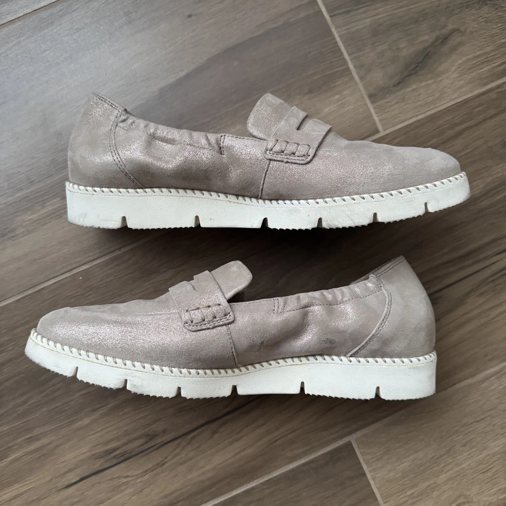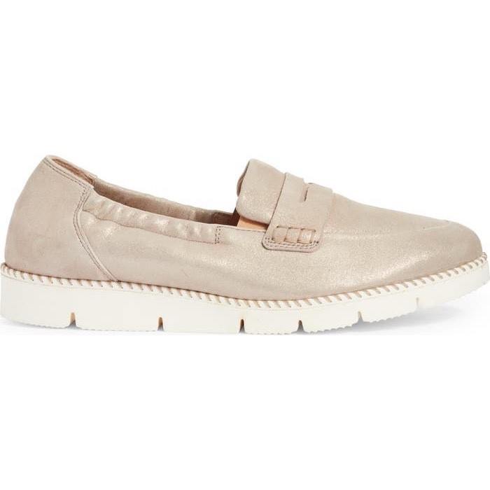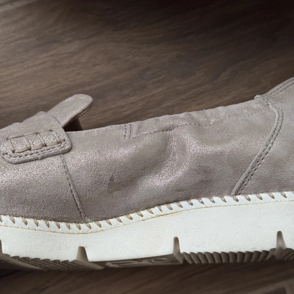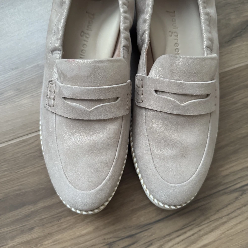 Whipstitched trim refreshes the silhouette of this supple suede penny loafer with an elastic topline and padded footbed for a perfectly cozy fit. Cushioned footbed. Leather upper and lining/synthetic sole. Great preloved condition, some marks on one side shown in last photo. Size 5 UK fits like a 8 US