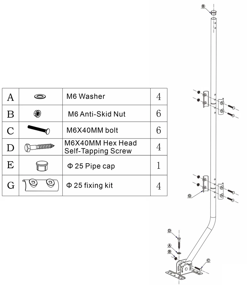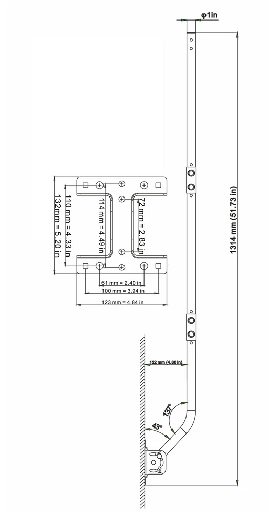 PBD Pole Extend Accessory 1. Outer Diameter is Max. 1 inch . 2. Length 16.75 inch . 3. Thickness 0.07 in . Reversible Design -- Both ends of the J-pole antenna mount can be used. 1" Diameter, 49 1/2" Arm Length Wall Mounts & Brackets -- Best accessory for you to mount the antennas and weather stations. With best size design, it can fit most outdoor antennas and weather stations. Adjustable direction -- The mounting pole can be rotated 60° for best reception angle to get strongest signals. Easy installation -- Comes with all the screws and plastic anchors, super easy to assemble.