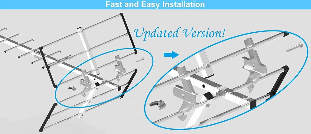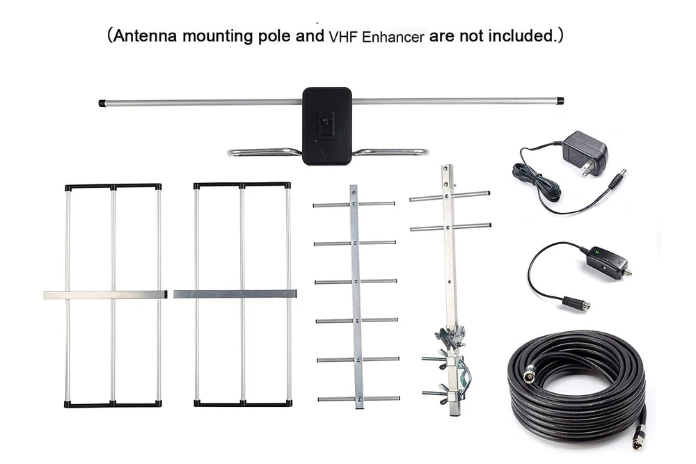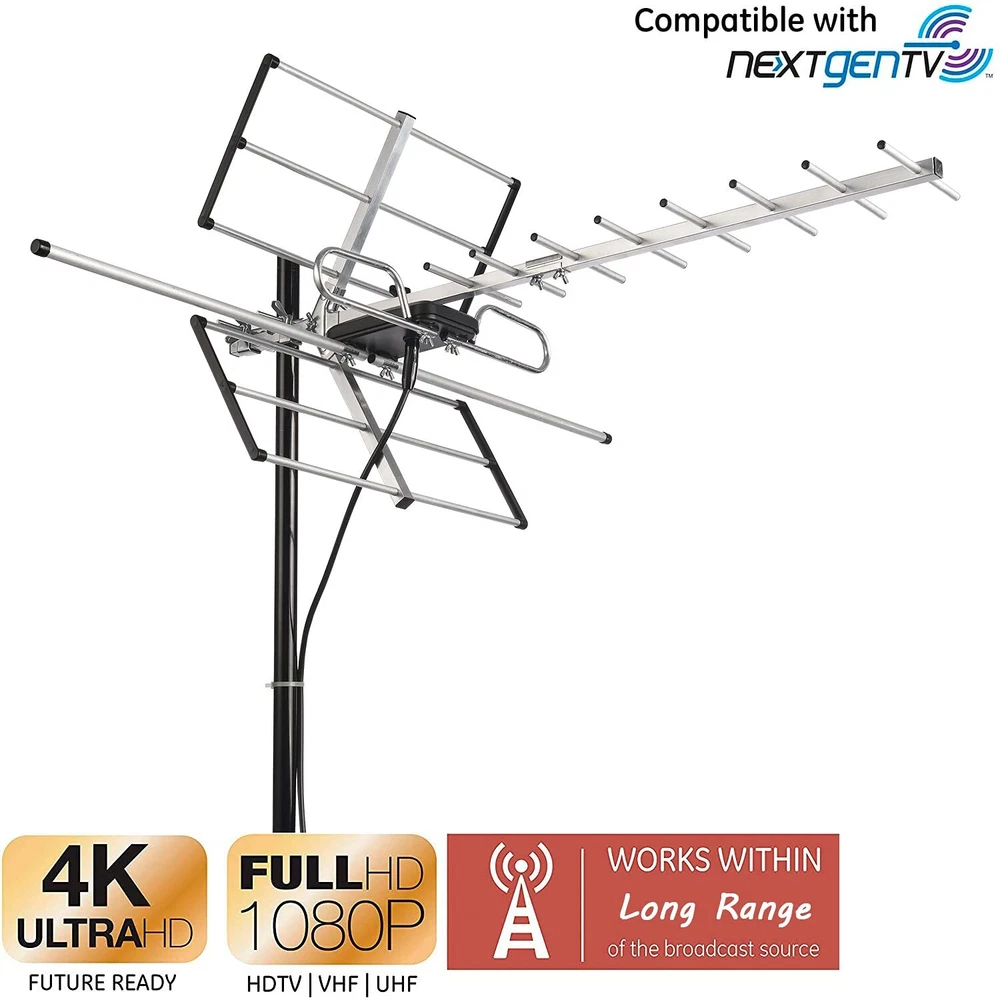 Receive Free Local HDTV and UHF/VHF Signals -- Full HDTV support 720p, 1080i, 1080p, 4K | Working Frequency: VHF 170~230MHz | UHF 470~860MHz | Receive free digital broadcast high definition TV signals. HDTV Reception & Long Range Outdoor TV Antenna -- Built-in high gain and low noise Amplifier ensures stunning pictures and sound reception within 120 miles range, making this the best long range TV antenna. Easy Installation -- Antenna comes mostly pre-assembled. Only minor assembly required. No tools required. Mounting pole not included - Put B07BNSL21G into Amazon search box for pole. Weather Resistant -- PBD outdoor TV Antenna is lightning protected, durable design with grounding done. Superior construction to withstand tough outdoor weather conditions. What you get -- PBD tv antenna with power supply adapter and 40FT RG6 Coaxial Cable.