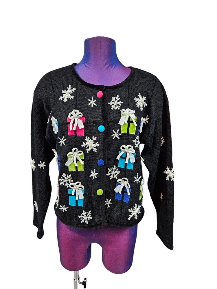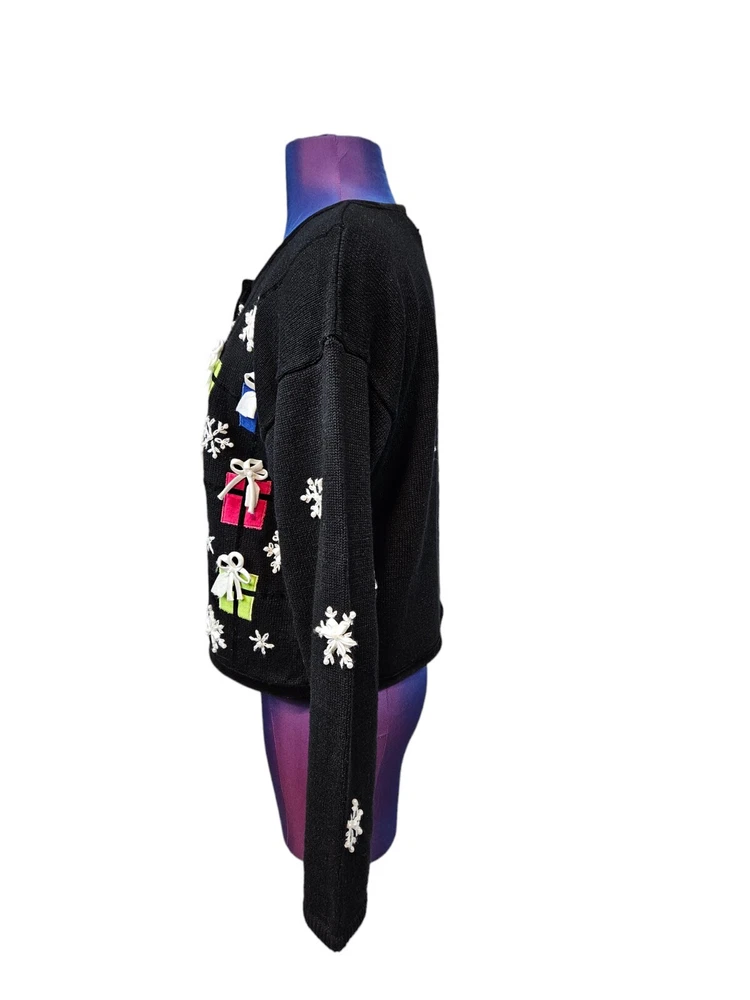 Neckline: Round Neck Type: Sweater Department: Women Size: S Theme: Christmas, Colorful, Holiday, Ugly Sweater, festive, ugly christmas sweater Occasion: Casual, Party/Cocktail, Travel Fit: Regular Fabric Type: Knit Personalize: No Color: Black Country/Region of Manufacture: Unknown Garment Care: Dry Clean Only Sleeve Length: Long Sleeve Character Family: na Brand: PBJ Sport Sleeve Type: Dolman Sleeve Features: Heavyweight Accents: Button Vintage: Yes Character: na Season: Winter Knit Style: Tight-Knit Pattern: christmas presents Seller Notes: “Excellent - no flaws” Size Type: Regular Style: Cardigan Material: Cotton, Ramie