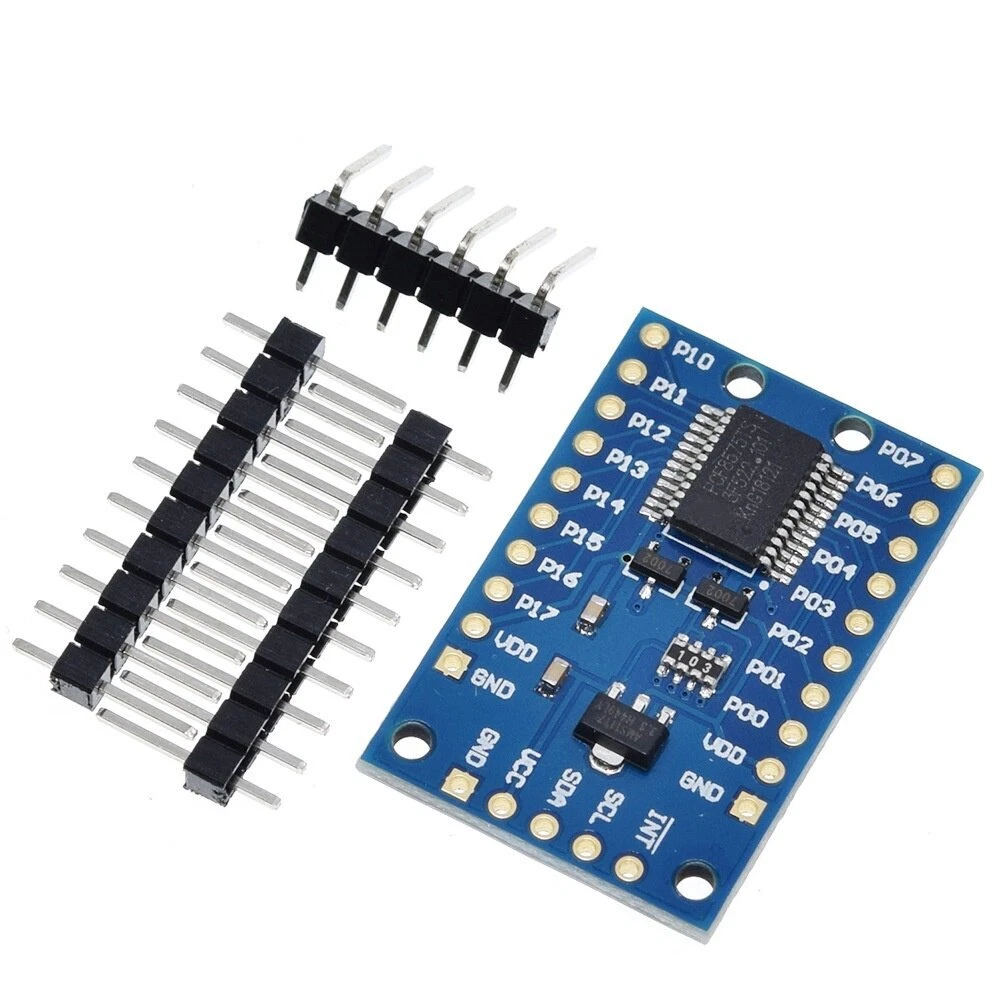 PCF8575 Module Expansion IO port Expander board DC 2.5-5.5V I2C communication control 16 IO ports For Arduino Descriptions: Have you run out of I/O pins? This great module allows the user to expand up to 16 I/O using only two I/O for control! The PCF8575 is controlled through an I2C interface and features 16-bits of quasi-bidirectional input/output pins. On board 3.3V level converter circuit, if you donot solder VCC-VDD pad, the PCF8575 level is 3.3V. If you solder it, the level will be the same with VCC Features: available library: PCF8575 Working voltage: 2.5 - 5.5V DC Working current: 100mA(MAX) I2C address: 0x20(default),can be modified by soldering A1 and A2 selection pads. 16 individually addressable pins. Each pin configurable for input or output Open-drain interrupt output pin for input change interrupt. Great for UNO R3 and other MCU to control simple relay, buzzer, button, led. Size: 4x2.1cm/1.57x0.83inch Package Includes: 1pcs * PCF8575 Module