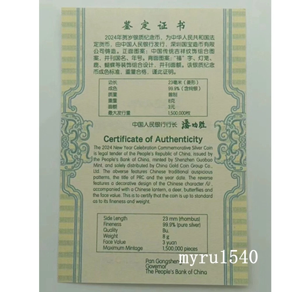 Item name:2024 China 3 YUAN Coin China New Year Celebration Good Fortune(Fu)Silver Coin 8g Purity :Silver 99.9%;Weight: 8 g;Diameter: 25 MM;Face Value: 3 YUAN Number of issues : 1500000PCS Issue time:2024 Issued by :The People's Bank of China ( Notes: The certificate number is random delivery ) We will send item with 3 business days when payment is confirmed, Usually 7-40 days arrived. The pictures are for reference only. We have more than one, we relist the same eBay listing and use the same/old pictures after we sold one item. So you may not receive the same item as in the pictures, however the item you’ll receive will be in the similar condition as in the pictures. We accept "PAYPAL" for payment。Good Luck for Everybody。Please view our other goods。 For more information, please contact to me.
