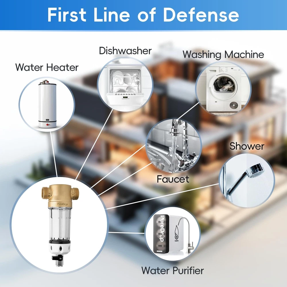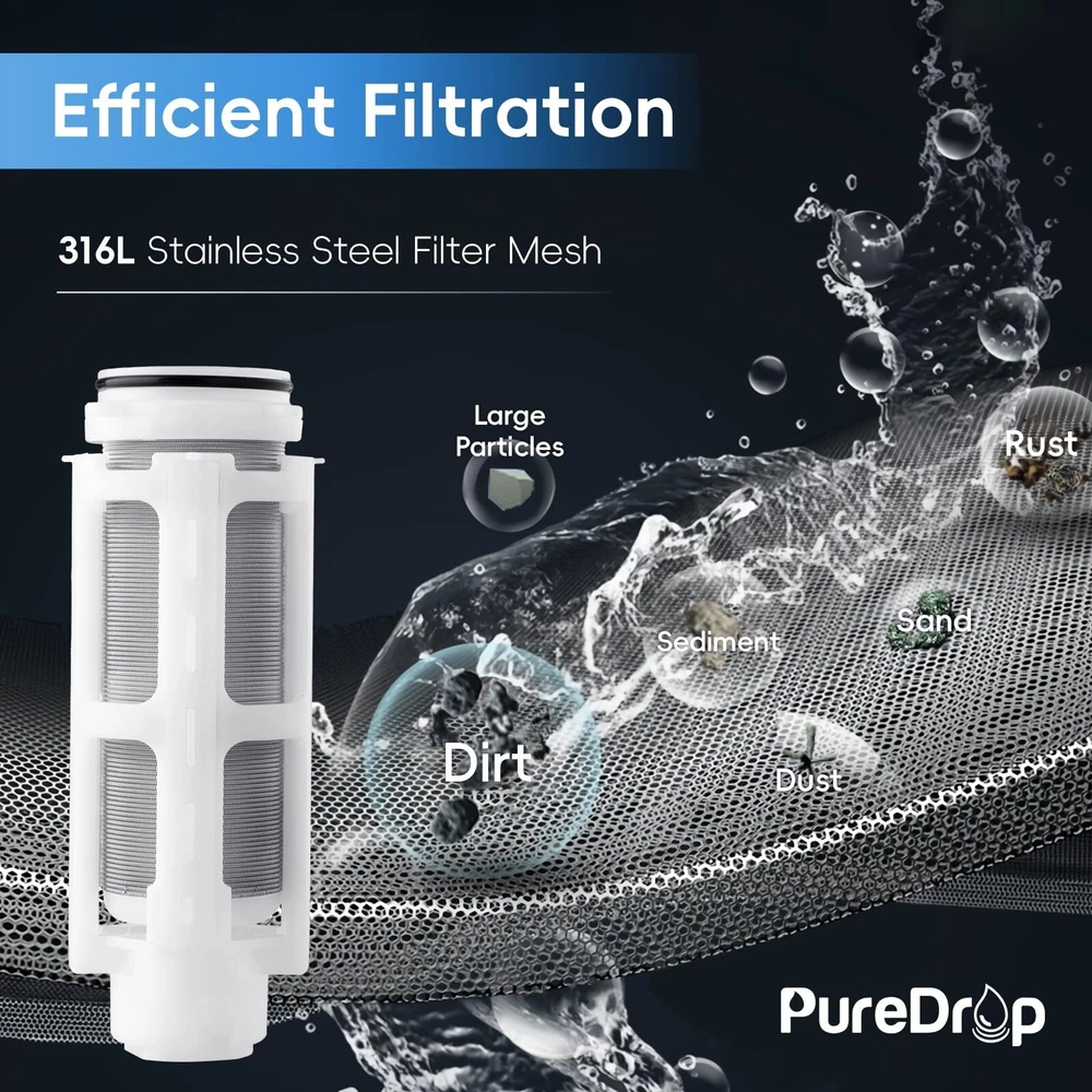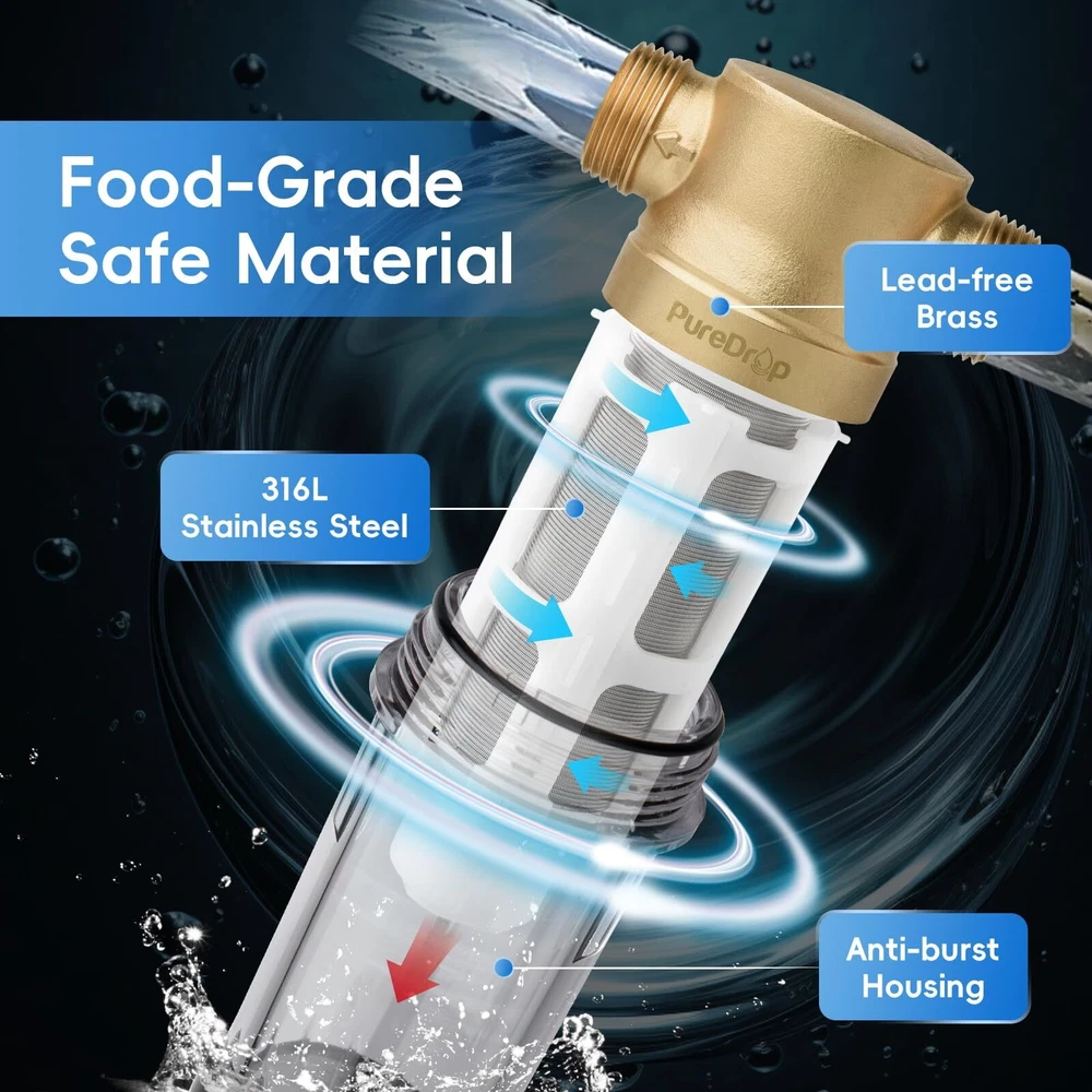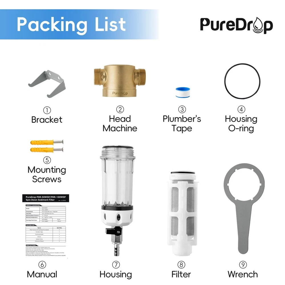 Effective Filtration Performance: PDR-50WSP guarantees effective filtration with its 50-micron mesh size and serves as a whole house spin-down sediment water filter, an ideal first-line defense in any home water filtration system. Protecting your plumbing from sediment, rust, dirt, sand, and large particles, it ensures clean water throughout. Reusable & Extended Lifespan: With its flushable and reusable capabilities, the PDR-50WSP effectively reduces the workload on subsequent finer filters. The spin down sediment filter featuring a built-in housing scraper for double-sided scraping, enhances the cleaning of particles attached on the surface of the mesh filter. Reducing product aging caused by frequent disassembly, thereby extending the service life of spin down filters. Easy Installation: The filter housing of the PDR-50WSP comes equipped with a pre-installed cartridge, along with 1" MNPT and 3/4" FNPT fittings, accommodating various pipe sizes in your house, simplifying the DIY installation process. Enjoy the ease and convenience of setting up your water filtration system without the hassle of installing the cartridge separately. Premium Durable Materials: Crafted with stainless steel mesh, a lead-free brass machine head and BPA-free water filter housing, the PDR-50WSP sediment water filter ensures water safety. The transparent housing allows easy monitoring of filter’s status. High Flow Performance: Experience a maximum flow rate of up to 750 gallons per hour, the PDR-50WSP sediment filters for well water guaranteeing swift and efficient water filtration. Enjoy a seamless flow of quality water without compromising on speed or effectiveness.