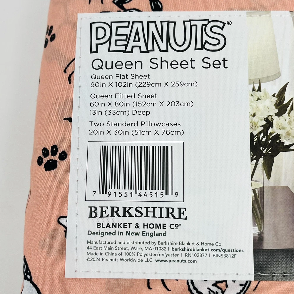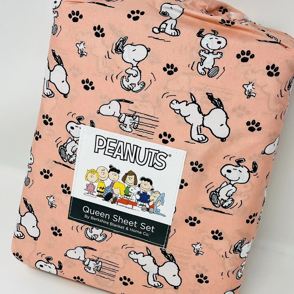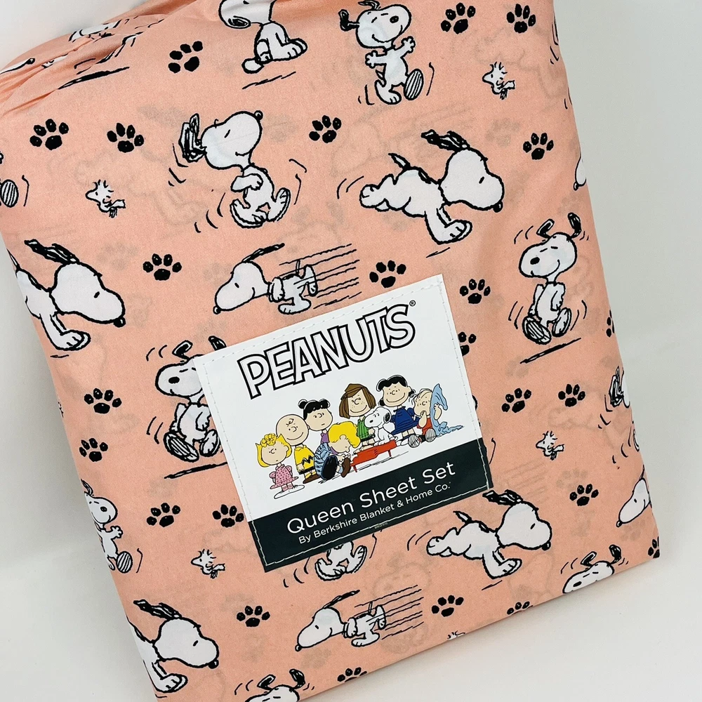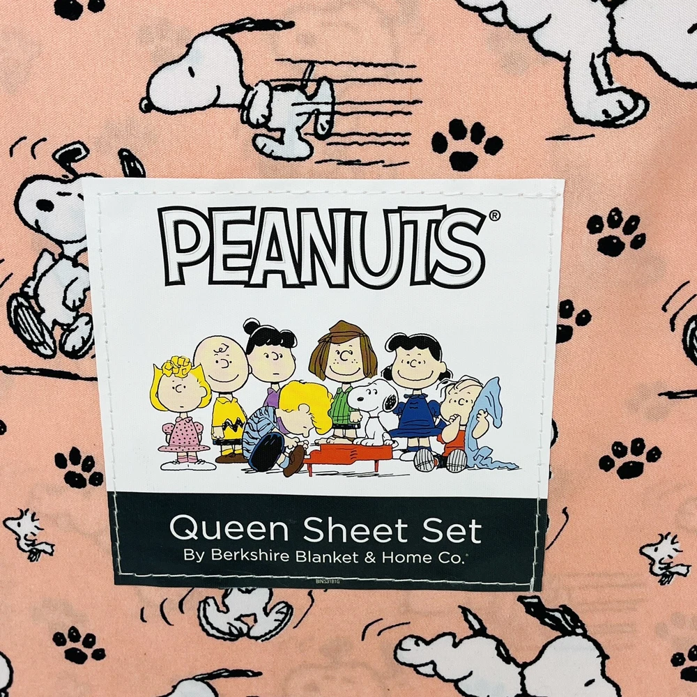 PEANUTS Snoopy QUEEN SHEETS SET Woodstock Day In The Life Peach Pink / Orange