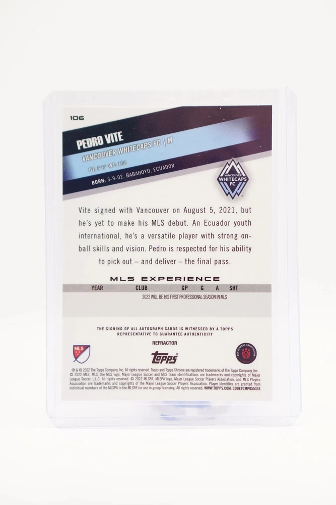 Parallel/Variety:AutographsSigned By:Pedro VitePlayer/Athlete:Pedro ViteManufacturer:ToppsAutographed:YesSeason:2022Team:Vancouver WhitecapsSport:SoccerSet:2022 Topps Chrome Major League SoccerLeague:Major League SoccerType:Sports Trading Card