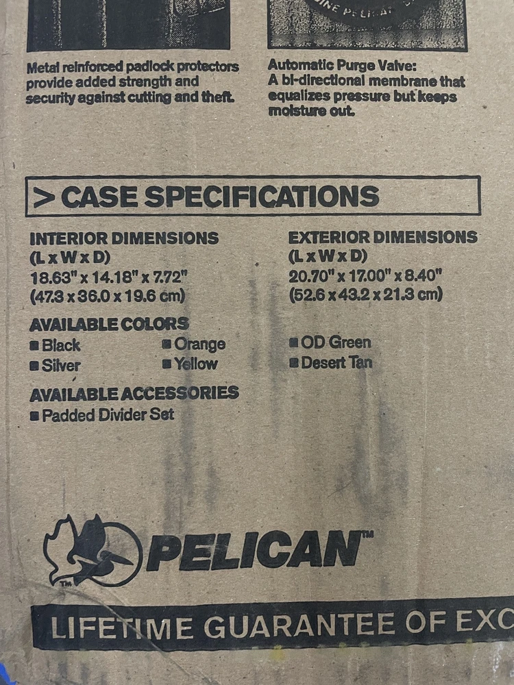 Features: Watertight, crushproof, and dust proof Easy open Double Throw latches Open cell core with solid wall design - strong, light weight O-ring seal Automatic Pressure Equalization Valve Comfortable rubber over-molded handle Stainless steel hardware and padlock protectors 2 level Pick 'N' Pluck™ with convoluted lid foam Personalized nameplate service available Unconditional Lifetime Guarantee of Excellence Specifications: Dimensions Inside: 18.43" x 14.00" x 7.62" (46.8 x 35.5 x 19.3 cm) Dimensions Outside: 20.62" x 16.87" x 8.12" (52.4 x 42.8 x 20.6 cm) Lid Depth: 1.75" (4.4 cm) Bottom Depth: 5.87" (14.9 cm) Total Depth: 7.62" (19.3 cm) Interior Cubic Volume: 1.14 cubic feet (32.22 cubic decimeter) Weight with foam: 11.9 lbs. (5.4 kg) Weight without foam: 10.58 lbs. (4.8 kg) Buoyancy: 69.89 lbs. (31.7 kg) Temperature Range: -40 / 210° F (-40 / 99° C)