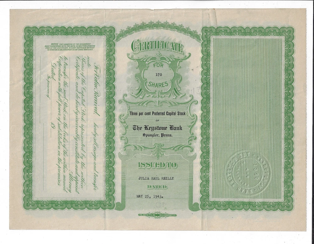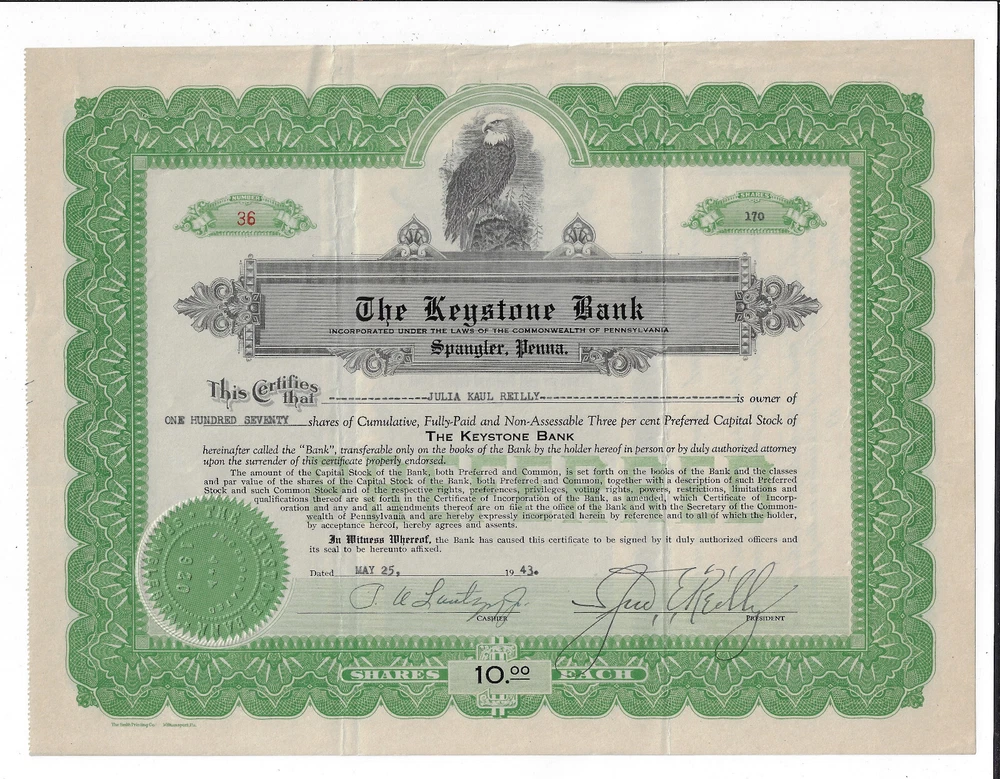 The certificate was dated May 25, 1943. . The company was incorporated in Pennsylvania in 1920. Nice low numbered certificate, #36 . The company was located in Spangler PA. I have increased the size of the scan so that you can see the document edges. Shipping is based on mailing within the United States. International shipping is additional. Please visit my store for additional stock certificates and bonds. I combine shipping if you request an invoice before paying. I leave favorable feedback for those who do the same.