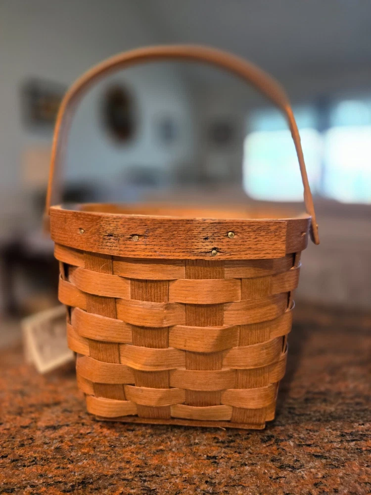 This beautiful Peterboro basket is a must-have for any collector of decorative items. Made of high-quality white ash, this medium-sized round basket features a brass logo, a hand-woven finish and a swinging handle and is perfect for all occasions. The basket's brown color and intricate woven design add to its charm, making it a great addition to any collection. This basket is 8 1/2" round and 6 1/2" tall. Handmade with care in the United States, this basket is part of the Peterboro brand and features the beloved Fruits Basket character family. Its unique features, including a handle and ample size, make it perfect for storing fruits and other decorative items. Add this stunning basket to your collection today!