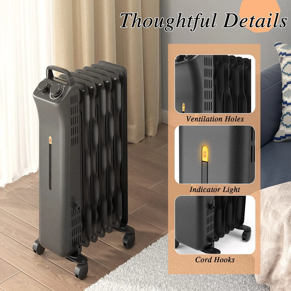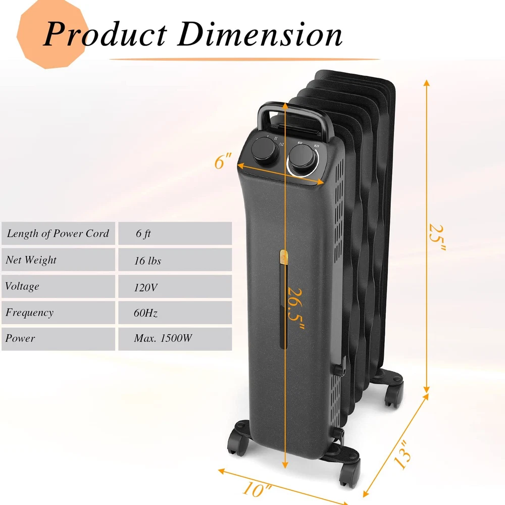 PETSITE 1500W Oil-Filled Radiator Heater, Portable Electric Space Heater with Adjustable Thermostat, 3 Heat Settings, Tip-Over & Overheat Protection,Quiet Heater for Home and Office, Black Up to 170 sq.ft. Heating for Small to Medium Room: With 3 heat settings (600W/900W/1500W) and 32°F - 194°F adjustable temperature, this oil-filled radiator space heater customizes your heating needs so that you are able to stay warm no matter how the outdoor temperature changes. And the diathermic oil is permanently sealed for great convenience. Safe Protection: This energy-saving oil heater with ventilation holes is safely designed with overheat protection and tip-over protection to ensure it will auto shut off if overheats or accidentally tips. Likewise, the V0 flame-resistant materials and ETL certification add additional safety. Save Your Energy Cost: This electric space heater is equipped with a built-in thermostat that is energy-saving. Once the room temp reach. It will detect the ambient temperature to determine if it needs to be automatically turned off or automatically activated. And the indicator light will tell you if it is running or not. Noiseless Operation: With no wind, no dazzling light and no disturbing noise operation, this oil-filled radiator heater wraps yourself in comfort and quiet heating all night long. Besides, 360° heating with double U-shaped heating conducting pipes makes the people around it feel warm and cozy. Portable Space Heater: This quiet heater is easy movement thanks to its convenient handle and universal wheels so that you can move it to the study room, bedroom or living room without hassle. Moreover, the cord hooks keep the power cord organized to avoid winding up the wheels. Description: Bring warmth to your daily life with this 1500W oil-filled radiator heater! By selecting the heat setting from 600W/900W/1500W and adjusting the temperature from 32°F to 194°F, this electric space heater meets your different heating demands to warm you cozily. During operation, the built-in thermostat will automatically shut off this heater if the room temp reaches the temp you have set for energy-saving. What's more, the noiseless operation creates a warm and quiet space for you to sleep or work. No matter which purpose you use it for, this ETL approved space heater will always stay safe with tip-over and overheat protection as well as V0 flame retardant materials. Considering your convenience, the diathermic oil is permanently sealed, so you do not have to replace the oil. And the universal wheels allow you to move it easily. Features: 3 heat settings (600W/900W/1500W) for various heating demands Select the appropriate temp from 32°F - 194°F adjustable temperature Greatly save your energy cost because of its built-in thermostat Tip-over and overheat protection for automatically turning off The permanently sealed oil avoids oil leakage issues V0 flame retardant materials and ETL certification for extra protection Provide you with a quiet and warm space for sleeping and working Warmth in the surrounding people with 360° heating U-shaped heating conducting pipes for efficient heating Handy handle and 4 universal wheels for hassle-free movement Hang the power cord on the cord hooks for clutter reduction Specifications: Color:Black Material:PC, ABS, PP, Steel Product Dimensions:13" x 10" x 25" (L x W x H) Net Weight:16 lbs Package Includes: 1 x Oil Heater 1 x Instruction Shipping We offer FREE shipping on all orders! We ship within Three business days of payment, usually sooner. We use a selection of shipping services such as UPS, FedEx, USPS etc. We only ship to the lower 48 states, no APO/FPO addresses or PO Boxes allowed. Local pickups and combined shipping options are not provided at this time. Return You can return a product for up to 30 days from the date you purchased it. Any product you return must be in the same condition you received it and in the original packaging. Please keep the receipt. Payment We accept payment by any of the following methods: PayPal Please pay as soon as possible after winning an auction, as that will allow us to post your item to you sooner! Feedback Customer satisfaction is very important to us. If you have any problem with your order, please contact us and we will do our best to make you satisfied. Contact Us If you have any queries, please contact us via ebay. We usually respond within 24 hours on weekdays. Please visit our eBay store to check out other items for sale! Thank you for shopping at our store.