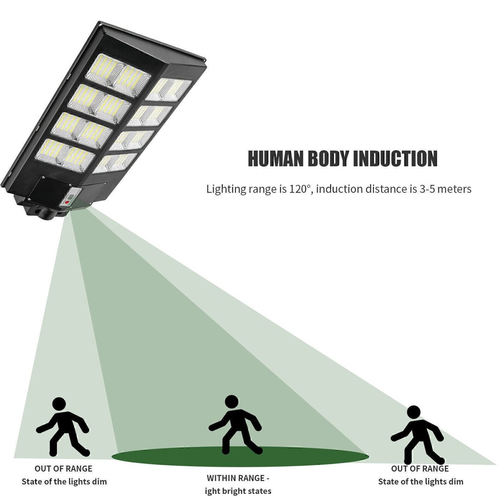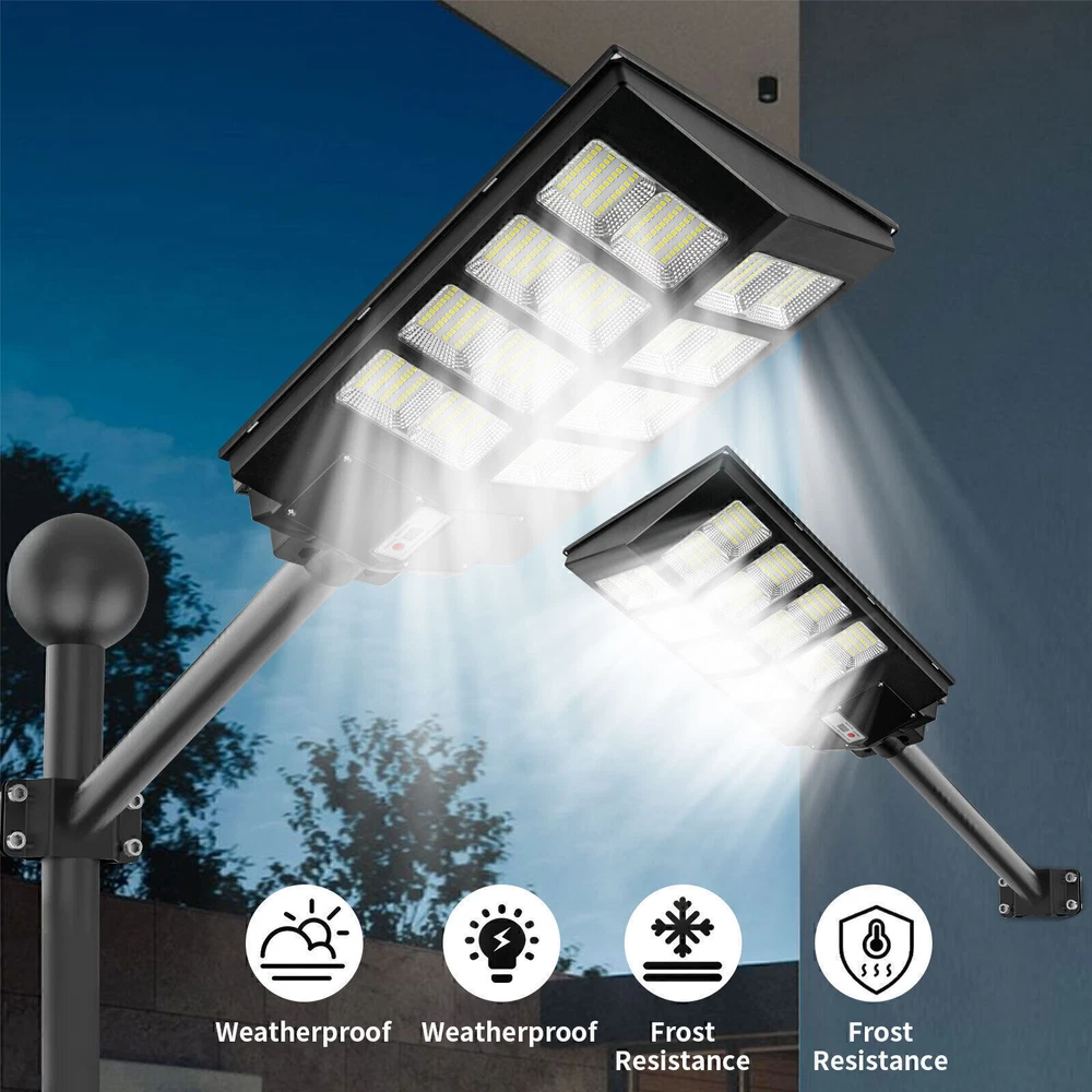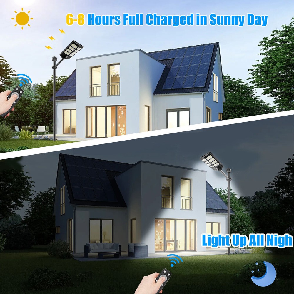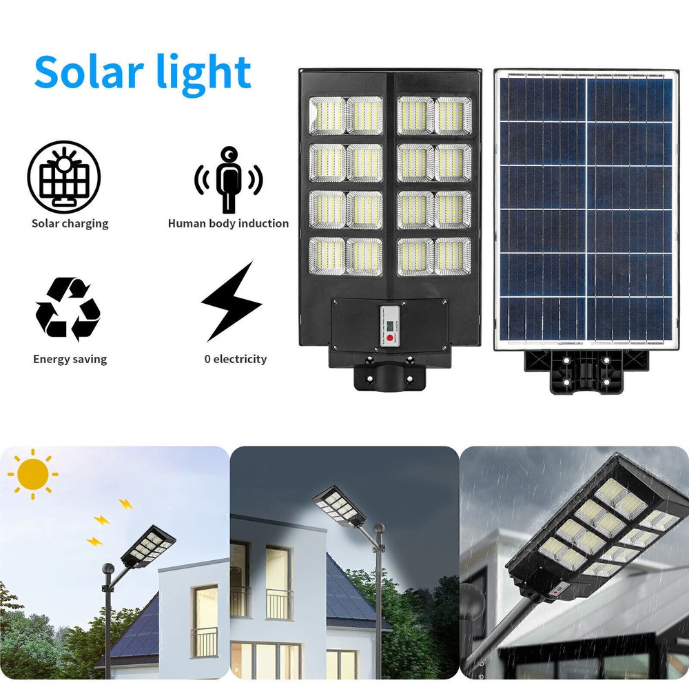 Product Description PFCTART 1600W LED Solar Street Light 9000000LM Dust-Dawn Road Lamp+Timer+Pole 【Fast charging and Dusk to Dawn】 Our commercial solar street light outdoor comes with 6500k cool white light, Built-in Super Bright LED Beads, it is more bright other led beads, it provided the clear and bright vision. The conversion rate of solar panel installation reaches 22.5%. Fully charging 6-8 hours in the daytime, the led street light can continue to work for more than 14 hours . Powered by solar and save electricity bill, automatically turns on at dusk and turns off during the day. Dusk to Dawn. No worry lighting lasts. 【Motion Sensor + Remote Control+Timing mode】 These led road street light are equipped with remote control, it is good for long distance to control, remote distance:12m. You can choose different lighting modes ( Light Sensing Mode, Motion Sensing Mode ) and light brightness for your needs. There are 4 levels of brightness that can be adjusted. Remote control operation can be timed,it Provides 5 Timing sets: 2H/3H/5H/6H/8H. Radar sensor mode, the lights are 100% brightness when motion is detected, and the lights are dim and 30% brightness when no motion, intelligently saving electricity, and increasing the lifetime of street lights. 【220° solar panel design and wide-angle lighting】 We have upgraded the solar panel and it has two-way wide-angle lighting, the lighting angle reaches 220°, and benefits from super bright led beads, allowing it provide a wider range of lighting and brighter light compared with ordinary 180° street lights. Illumination area up to 1600-1900sq.ft, we recommended installation height:6-8M.It can be lighting up street and offer convenience for walking at night. 【IP67 Waterproof and Durable】 The outdoor solar street light adopts high-quality material, which is lightning-proof, rain-proof, oxidation-proof and anti-exposure. IP67 waterproof function makes it work on a rainy day. Its adaptable working temperature is -22℉~140℉. This outdoor Solar Parking lot Lights pole has 15000mAh battery capacity, is more stable and longtime lasting. 【Easy to install and wide application】 This street light solar powered has 2 installation ways, it is easy to install on poles and walls. The installation accessory included in the package, no wiring is required, which can be easily installed outdoor. Perfect for street and roads, parking lot, basketball court, garage, garden, street, courtyard, farmhouse and squares, etc. Specifications Fully charged lighting: 20 hours Solar panel: 6V/25W Battery capacity: 3.2V 20AH Product function: radar + light control + remote control Lamp body size: (H*W*L)60.5*8*35cm/23.8*3.15*13.78inch Lamp beads: 640 Irradiation area: 200 square meters Installation height: 4-6m Material: ABS engineering plastic PC cover Waterproof :IP67 Remote control :Normal light or induction mode Remote control battery type: 2*AAA (included) Life: 100000 (h) About Us Payment Shipping Returns Contact Us Welcome to our store, your support is the biggest driving force for us to move forward. Our main businesses are solar panels, lithium iron phosphate batteries, electric vehicle chargers, solar outdoor/indoor lights, travel solar panels, etc . The product is directly connected with the factory to ensure product quality. Please rest assured to buy, we will provide you with a perfect shopping experience! We accept payment via Paypal only. Payment must be completed within 7 days. If you have any problems about payment, please contact us by ebay message. We only ship to confirmed eBay addresses. Please comfirm that your eBay address is in line with your shipping address. Most of our products are provided with shipping services. Also, the each additional item means exactly the the same color and size. The item shipping from USA. It takes about 5-10 working days to your addresses; Transit time may be a little delayed because of the bad weather. If you do not receive your item within 15 working days since payment finished, please contact us immediately for further assistance. If you have any issue about Item. Please contact us with 7 days since you receive the item and and return to us within 30 days from the delivery date for exchange or refund. If you need return, please contact our customer service representative, let us know the detailed problem and send us some pictures for confirmation. We strive for 100% customer satisfaction! Positive Feedback is very important to us. If you have any questions, please feel free to contact us via "Ask seller a question" . We will reply your email within 24 working hours. About Us Welcome to our store, your support is the biggest driving force for us to move forward. Our main businesses are solar panels, lithium iron phosphate batteries, electric vehicle chargers, solar outdoor/indoor lights, travel solar panels, etc . The product is directly connected with the factory to ensure product quality. Please rest assured to buy, we will provide you with a perfect shopping experience! Payment We accept payment via Paypal only. Payment must be completed within 7 days. If you have any problems about payment, please contact us by ebay message. Shipping We only ship to confirmed eBay addresses. Please comfirm that your eBay address is in line with your shipping address. Most of our products are provided with shipping services. Also, the each additional item means exactly the the same color and size. The item shipping from USA. It takes about 5-10 working days to your addresses; Transit time may be a little delayed because of the bad weather. If you do not receive your item within 15 working days since payment finished, please contact us immediately for further assistance. Returns If you have any issue about Item. Please contact us with 7 days since you receive the item and and return to us within 30 days from the delivery date for exchange or refund. If you need return, please contact our customer service represen