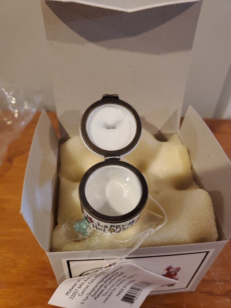 My Midwest of Cannon Falls porcelain hinged boxes arrived yesterday in perfect condition. My purchase was wrapped well. It's appearance was spot on with the listing. This is a super quality trinket box, so it's a tremendous value-add. Many thanks to this A+++++ seller; nice job.