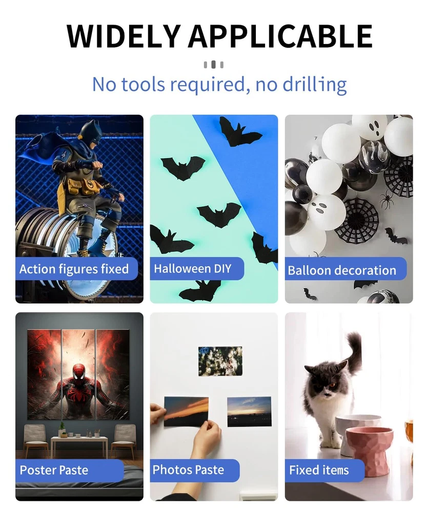 【Upgrade Stickiness & Oversize】PHIXBEAR oversized mounting putty double sided tape heavy duty dots for walls are crystal clear, upgrades industrial strength adhesive on both sides, super strong adhesion, instant hold, action figures keep standing and anti fall , provides a quick and easy adhesive solution. 【No residue & No damage to wall paint】Our transparent museum glue point dots putty stickers is made of high quality PP material,which has good elasticity and is durable.Easily hang your artwork without ruining the beauty of the craft, while being easy to remove without leaving any residue. Tape for walls no damage to paint, Protect your project! 【Safe & Non-damaging Items】Our non-toxic sticky tack dots tabs are acid, fume, and lignin free; it can be safe used on photos action figures surfaces, so you don't have to worry about damaging the surface of precious collections and photos. Perfect for protecting antiques and collectibles from falling and breaking. 【Wide application】Our clear removable gel wax putty dot does not spoil the beauty of the collection and adheres easily to most surfaces such as crafts, paper, plastic, wood, leather, glass, etc. You can use clear, removable gel putty to paste posters, pictures, scrapbooks, parties, Christmas decorations, design crafts, or other diy crafts, perfect for home, office, and school projects. 【Easy to Use】Instant gluing Install poster putty with no mess , no tools, no long wait for glue to dry, just peel off the heavy duty adhesive sheet and stick where you want. You can completely get rid of the mess of traditional liquid glue or tape. Our installation putty glue points are faster, safer and cleaner. 【Use tips】First stick on the surface of the object, and then use the small tool in the package to remove the surface protective film, easy to use!