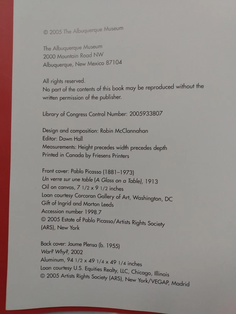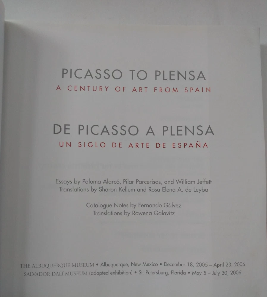 ISBN-10:0977991024Type:PaperbackItem Weight:0 OzAuthor:William Jeffett, Paloma Alarcó, Pilar ParcerisasPublication Year:2005Genre:ArtLanguage:EnglishBook Title:Picasso to Plensa : a Century of Art from SpainItem Height:1.2 inPublication Name:The Albuquerque MuseumPublisher:Albuquerque Museum, T.H.E.Item Length:11 inSeller Notes:“The book is solid and in very good condition. There is slight wear around the edges of the cover.”Item Width:11 inISBN:9780977991020Illustrator:YesNumber of Pages:344 Pagesgtin13:9780977991020Format:Trade PaperbackTopic:General, European