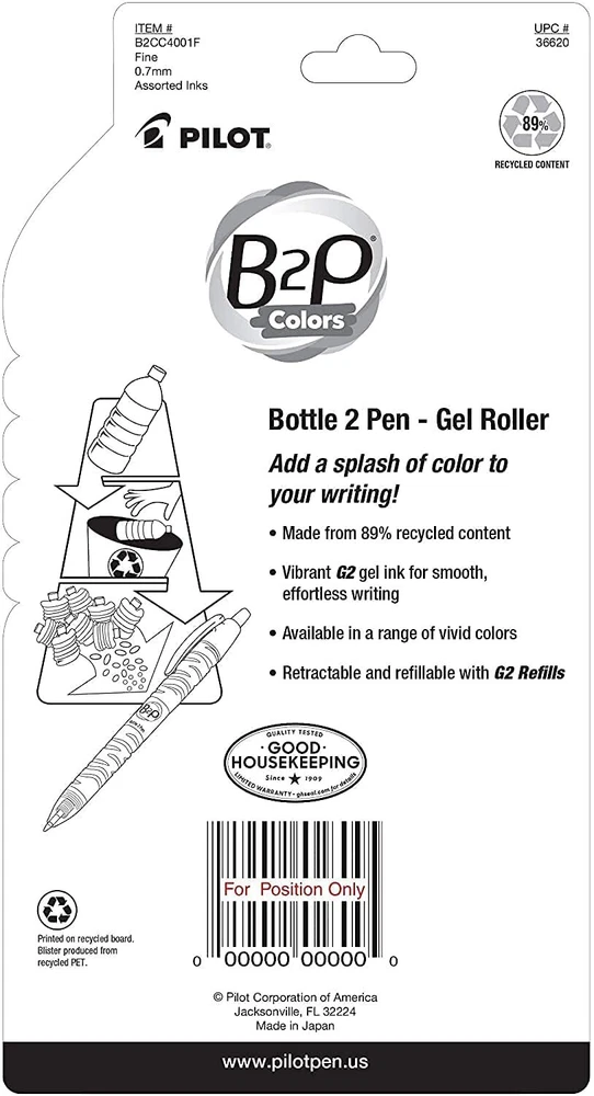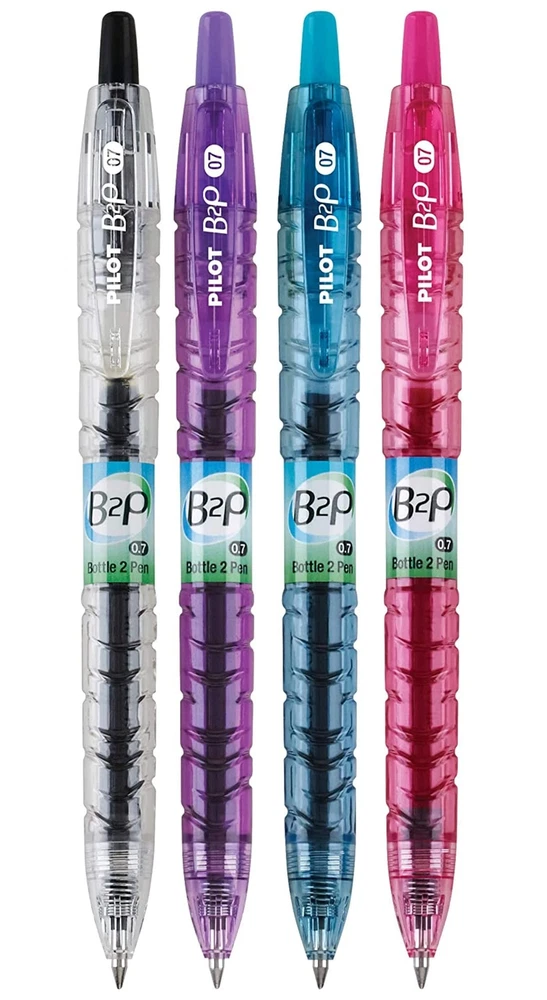 PILOT B2P Colors - Bottle to Pen Refillable & Retractable Rolling Ball Gel Pen Made From Recycled Bottles, Fine Point, Assorted Color G2 Inks, 5-Pack With the B2P, from Bottle 2 Pen Gel Roller, Pilot has launched the world's first pen made from recycled bottles! In recent years, plastic water bottles have been under close scrutiny for their environmentally unfriendly characteristics. Almost every hour, close to 250,000 plastic bottles enter landfills and comprise close to 50 percent of all recyclable waste. Mae from 89 percent post-consumer recycled plastic bottles, the Pilot B2P Colors features vibrant gel ink and a fine 0.7mm point for smooth, effortless writing. Designed to mimic a bottle of water, the body of the B2P Colors Pen is translucent to match the ink color with unique striations like those commonly found on water bottles. Retractable and refillable, the B2P uses the same ink refill as the Pilot G2, America's number one selling gel pen. Available in a variety of bold colors and barrels, the writing quality of the B2P meets the same high performance standards found in all of Pilot Pen's products. Pilot Pens. Simply write.