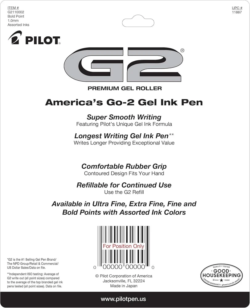 Pilot G2 Retractable Premium Gel Pens are equipped with an extra comfortable grip that will keep your hands from aching during those long days. Write more, do more, achieve more with Pilot's G2 Gel Ink Pen. At work, home, or anywhere, you need a pen that keeps working even longer than you do. From taking notes to writing your novel by hand, G2s keep the ink and your ideas flowing. For the task at hand, G2 should be your Go-2. The Ideal Pen for Overachievers: The smooth writing, long-lasting Pilot G2 Premium Gel Ink Pen features a comfortable rubber grip, and is available in ultra fine, extra fine, fine, and bold point Longest Lasting, Refillable Gel Ink: Proven to be the longest writing gel ink pen among top brands, the smooth-writing, retractable G2 gel ink pen is a classic choice for all your writing needs Perfectly Suited For You: If you love the original Pilot G2, you'll want to try our full G2 line of Mini, Metallic, Mosaic, and Fashion gel ink pens in a variety of sizes, barrel designs and colors Trusted Quality: We've been making pens for over 100 years; Whether you're taking notes, stocking up on school or office supplies, or writing in a bullet journal, Pilot has the perfect pen for you Power to the Pen: Pilot makes exceptional writing instruments to suit all your needs; We have fountain, ballpoint, retractable, erasable and gel ink pens, whiteboard markers and more for every writing style