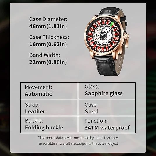 Product information description: ⌚【Roulette Watch for Men】Case legth 46mm/1.8in, case thickness: 18mm/0.7in, Case width 22mm/in. The miyota NH35A independently modified Roulette is used in high-quality plastic, strong structure.The dial is composed of 12 playing cards, and the number corresponding to each playing card is the time. ⌚【Automatic Watches for Men 】Roulette watch case is 316L Stainless Steel. Roulette contains 1 white ceramic beads.The digital roulette will rotate with a slight shake of the wrist, and Slowly stops when the wrist is at rest (when the watch is in a horizontal position). There is no button control. ⌚【3ATM Waterproof 】3ATM waterproof watch, can withstand the damage to the watch caused by daily splashing, hand washing, sweat, etc, but it is not suitable for diving and hot water environment,such as sauna. ⌚【Mechanical Watch】Operate without battery, automatic self-winding. However, proper manual winding is indispensable,which can effectively reduce time deviation. (⚠Note: Mechanical watch is different from quartz watch. Insufficient mechanical kinetic energy will cause the watch to stop, please winding it in time.) ⌚【Gifts for Men】If you want your loved this roulette wheel watch, let friend or leader to feel the same happiness, you can also generously give this men watch as a gift on Valentine's Day, Father's Day, Christmas, Thanksgiving, parties, anniversaries or other holidays. ⌚【100% After-sales Service Guarantee】 : Purchase without Worry. We offer a 30-day money-back guarantee for any reason.If you have problems during use of the wristwatch, please don't hesitate to contact us. We will offer you professional service. Brand PINDU Model PINDU& Light Luxury Series Reference Number PD6626 Subcategory Watches Category of movement Mechanical movement Applicable People Men's watches Colour Red black,Blue black Year/season of listing In 2024 Display Type Pointe、Number Case Size 46mm Case Material stainless steel Case Color Gold Case Shape Barrel type Case thickness 16mm Dial Color Gold Band Color Black Band Material Leather Bezel color Gold Band Size 22mm Mirror material Mineral reinforced glass Dial shape Card Dial Table buckle type Butterfly double snap fastener Display Analog and digital Producing country China Waterproofness 3TM Packing specifications With original box/packaging After-sales service Returns are available within 30 days Feature 3TM waterproof, accurate walking, daily wear, sports; 12-hour display, minute display. Warm reminder: 1. Please pay attention to confirm whether the delivery address is correct when placing an order. If there is an address error, please contact the seller in advance to correct it. If not, the default address is correct. 2. If you still don't understand the product description before placing an order, you can contact the seller in advance to understand the situation. If you don't communicate in advance, you will know the description attributes of the sold product by default. Thank you very much for your trust and support of our watch products. Your support is the driving force for our continuous progress! Thank you sincerely for your purchase and look forward to serving you again! Our Policy 100% Authentic Guarantee with standard international express shipping. Products are shipped from China or the US (as indicated in the product description). Fast Shipping: Items dispatched within 24 hours (holiday delays may apply). 100% In-House Brand: All products come with original packaging. 30-Day Hassle-Free Returns: Easy returns/exchanges for unsuitable items. 100% Customer Satisfaction: Achieved through excellent communication. If the customer's country collects any import taxes or other taxes, we will not assume any responsibility. Shipping Instructions We do ship these items worldwide, and they typically take 15-25 days to reach the destination. If the product takes significantly longer than 25 days to arrive, please contact us in advance. Remote areas or certain locations may require an additional 3-7 days for delivery. If the customer's country imposes import duties, we are not responsible for paying any import taxes—the buyer is solely responsible for these charges. For standard shipping: Items shipped from China use eBay SpeedPAK Standard. Items shipped from the US use standard carriers such as Yun Express, DHL, UPS, or USPS. Return Policy We strive our best to provide our customers with the highest level of service. If you return the items within 15 days of receiving them for any reason, we will issue a refund. However, the buyer must ensure that the returned items are in their original condition. If the items are damaged or lost during return, the buyer will be responsible for such damage or loss, and we will not provide a full refund. The buyer should attempt to file a claim with the logistics company to recover the costs incurred due to damage or loss. Note: The buyer is responsible for the return shipping costs.