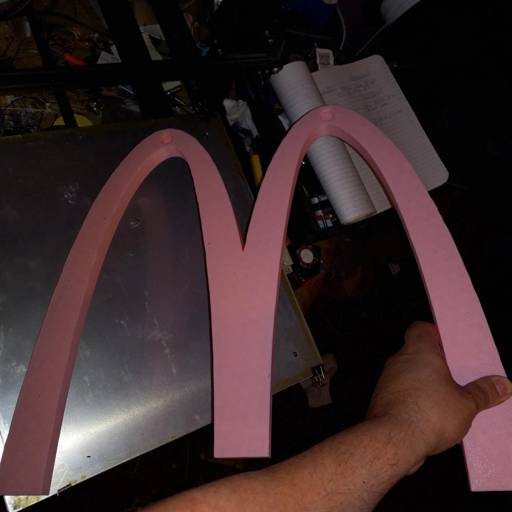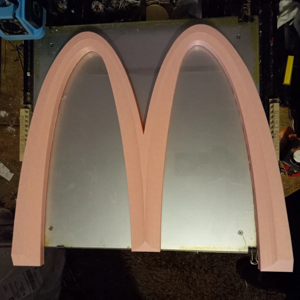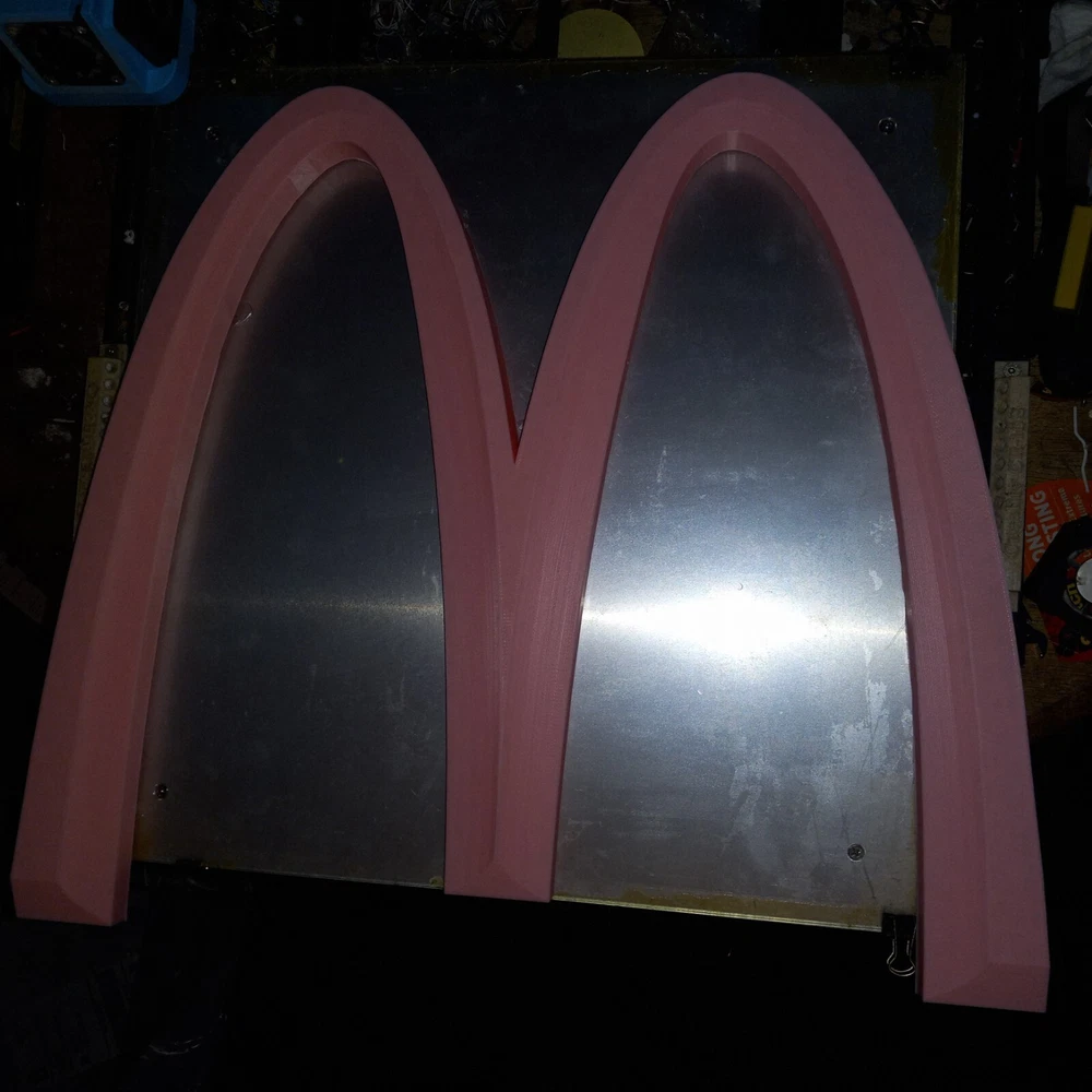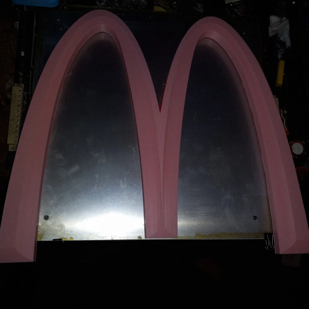 SALE NEW PINK VERSION! NEW ITEM! NOW LARGER AT 19 INCHES. I NOW HAVE A 500MM 3D PRINTER TO MAKE THIS BIG 19 INCH MCDONALDS LOGO These are made by order, not premade so these take time and only one machine is big enough to make them. Each logo sign takes almost two days each. limited TO 3 PER ORDER PLEASE. IT TAKES TIME TO MAKE THESE LARGE LOGOS LIMITED TIME OFFER! WAS $59.99. NOW $42.99! McDonald’s Big PINK “M” 3D Advertising Sign Golden Arches 19"×17" 3D Printed. 26MM THICK This is a 3D printed 3D McDonald's Golden Arches big M PINK color. 3D printed. Slight design modifications. I designed on software. It is slightly different the way the triangular like pattern on top I could only get right on the inner design of the M. So the outer parts of the M is not like the inner. It still has that look the way I had to do it. The software I use is funny about curves and straight edges so I had to make like in pictures. These are 19 inches by 17 inches square diameter. Not a mass produced sign. Used with high quality pla plastic Filiment. Takes nearly 24 hours to make. And about an inch and a half thick. Light weight but sturdy. A nice alternative look to the original and a cheaper option then buying expensive original McDonald's logo Arches. Fast shipping. CAN BE MADE IN ANY SIZE 19 INCHES OR UNDER. I ALSO HAVE A 25 INCH VERSION. CAN BE MADE IN ANY COLOR. MESSAGE ME WITH COLOR OR LEAVE NOTE ON PURCHASE FOR COLOR.