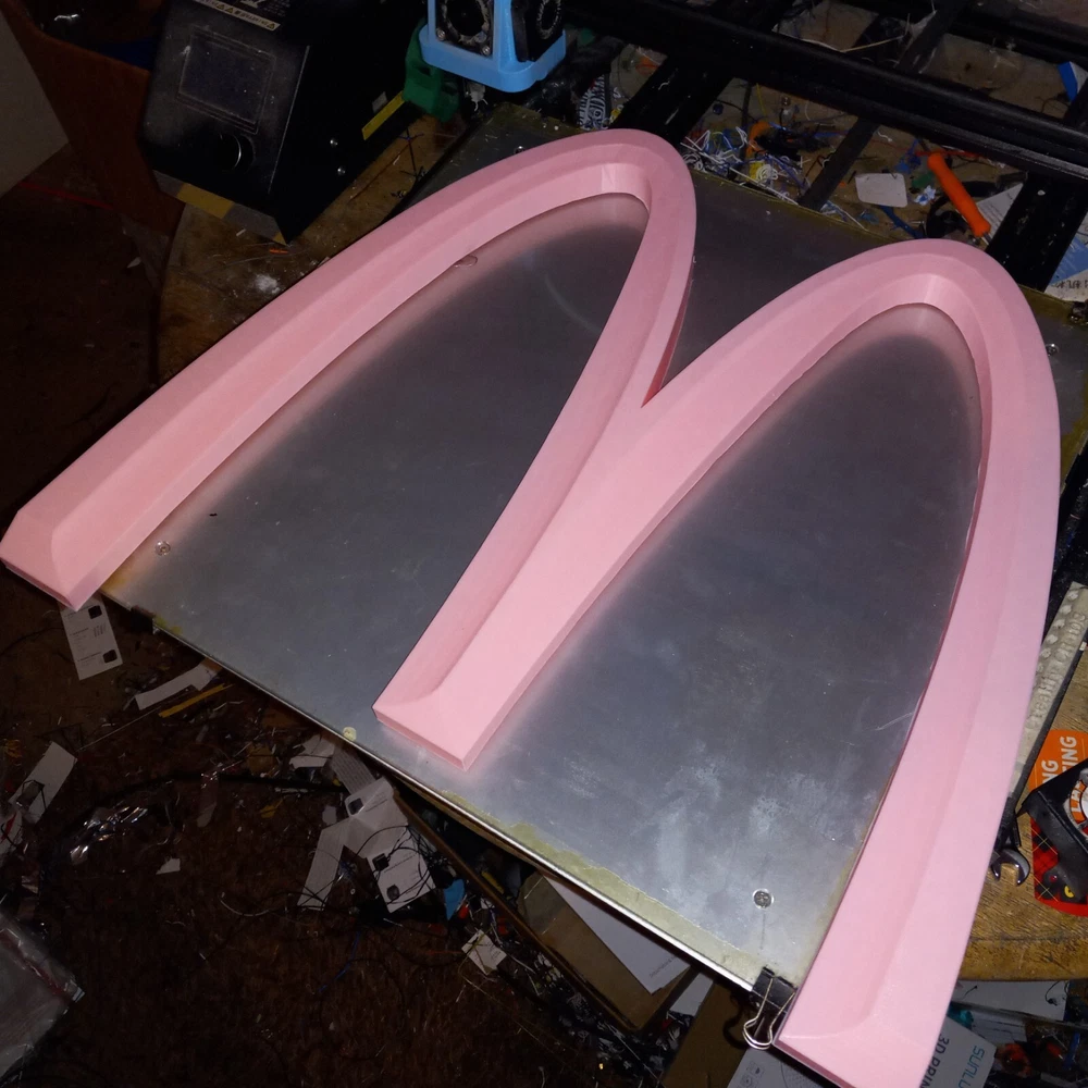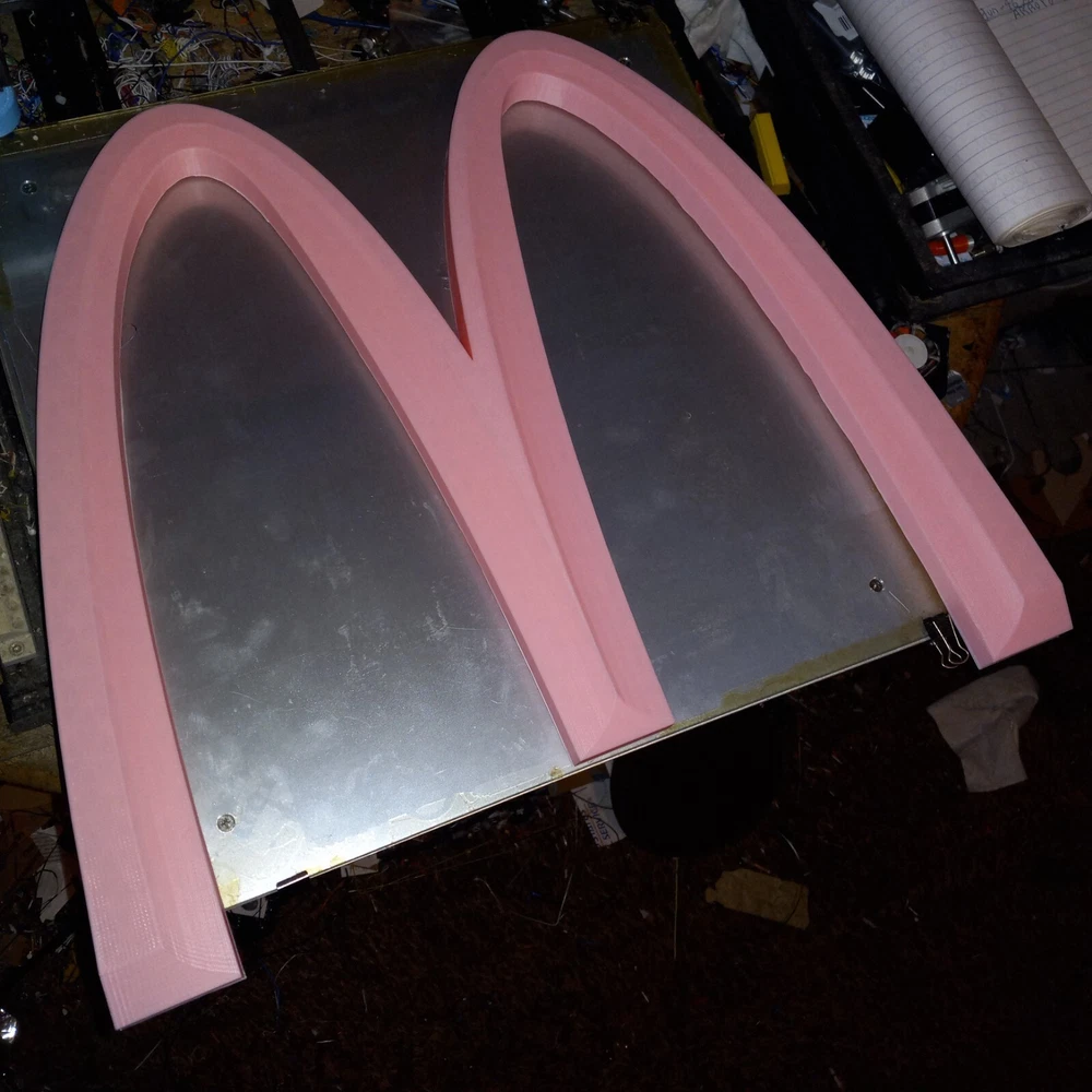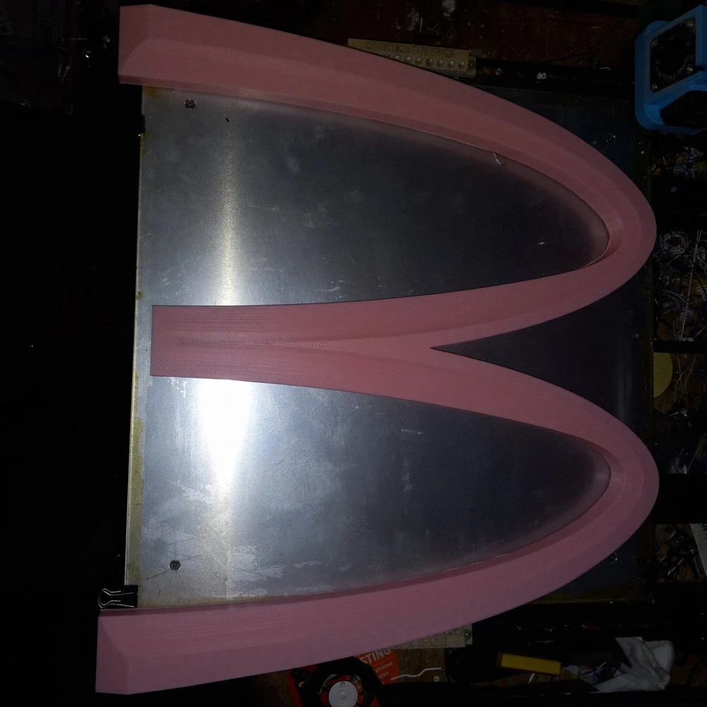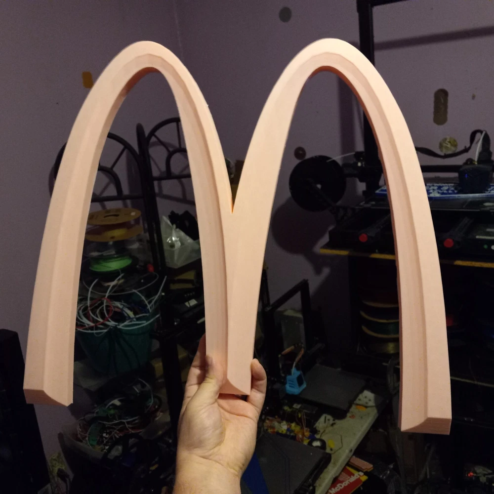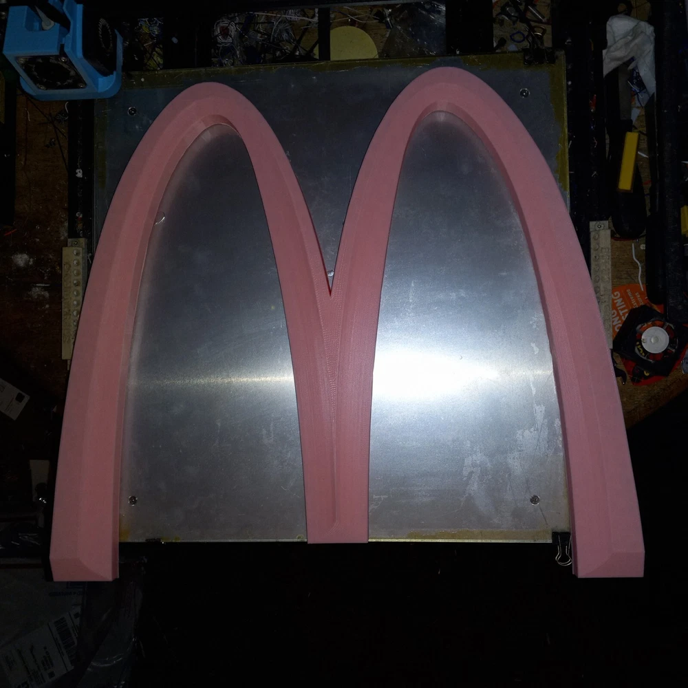 SALE NEW PINK VERSION! NEW ITEM! NOW LARGER AT 19 INCHES. I NOW HAVE A 500MM 3D PRINTER TO MAKE THIS BIG 19 INCH MCDONALDS LOGO These are made by order, not premade so these take time and only one machine is big enough to make them. Each logo sign takes almost two days each. limited TO 3 PER ORDER PLEASE. IT TAKES TIME TO MAKE THESE LARGE LOGOS LIMITED TIME OFFER! WAS $59.99. NOW $42.99! McDonald’s Big PINK “M” 3D Advertising Sign Golden Arches 19"×17" 3D Printed. 26MM THICK This is a 3D printed 3D McDonald's Golden Arches big M PINK color. 3D printed. Slight design modifications. I designed on software. It is slightly different the way the triangular like pattern on top I could only get right on the inner design of the M. So the outer parts of the M is not like the inner. It still has that look the way I had to do it. The software I use is funny about curves and straight edges so I had to make like in pictures. These are 19 inches by 17 inches square diameter. Not a mass produced sign. Used with high quality pla plastic Filiment. Takes nearly 24 hours to make. And about an inch and a half thick. Light weight but sturdy. A nice alternative look to the original and a cheaper option then buying expensive original McDonald's logo Arches. Fast shipping. CAN BE MADE IN ANY SIZE 19 INCHES OR UNDER. I ALSO HAVE A 25 INCH VERSION. CAN BE MADE IN ANY COLOR. MESSAGE ME WITH COLOR OR LEAVE NOTE ON PURCHASE FOR COLOR.