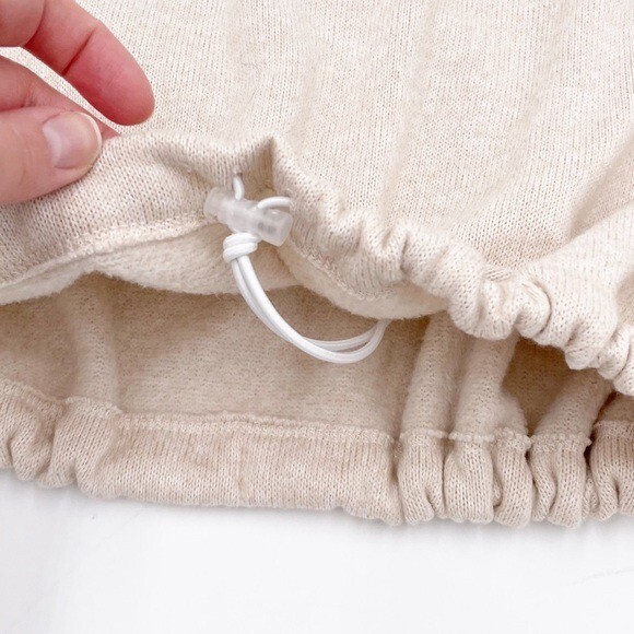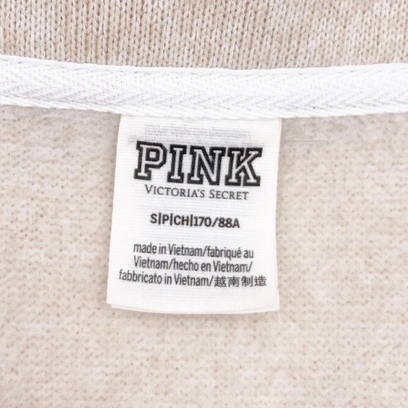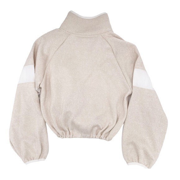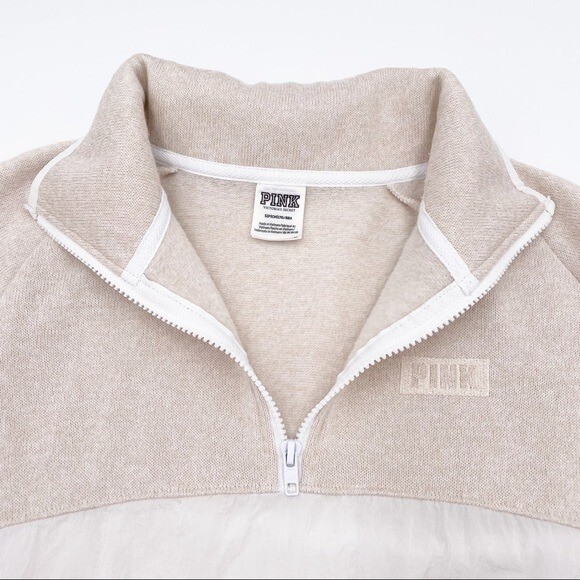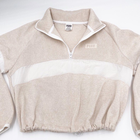 Victoria's Secret Sweater Knit Cropped Half-Zip Pullover Tan with white paneling Body is soft knit while panels are made of windbreaker material Cropped fit with drawstring waist for adjustment Perfect neutral tones Size Small Gently used Approximate measurements: Pit to pit: 22” Length from shoulder: 18.5” Sleeves: 27”