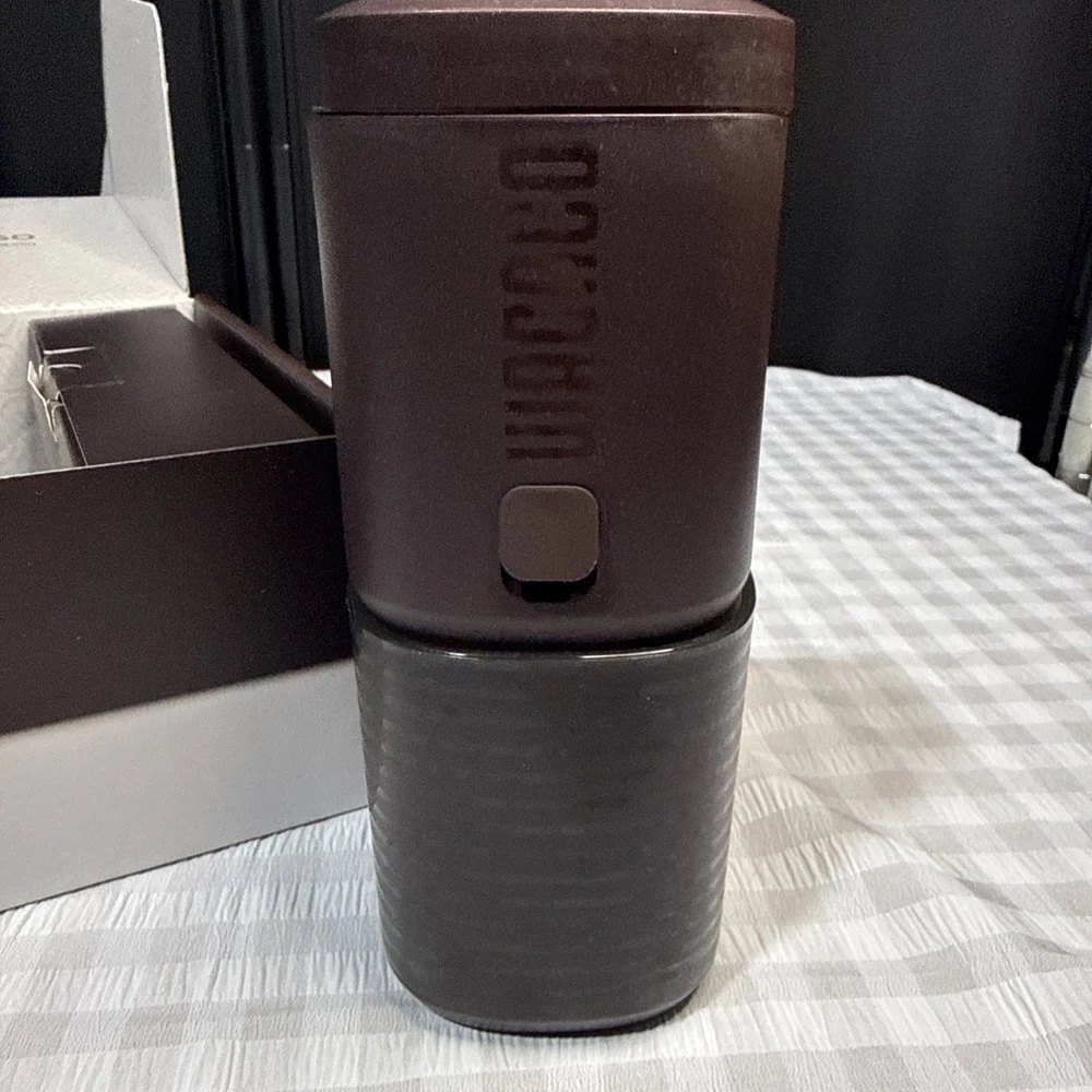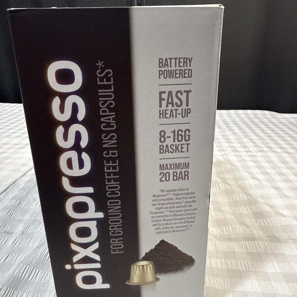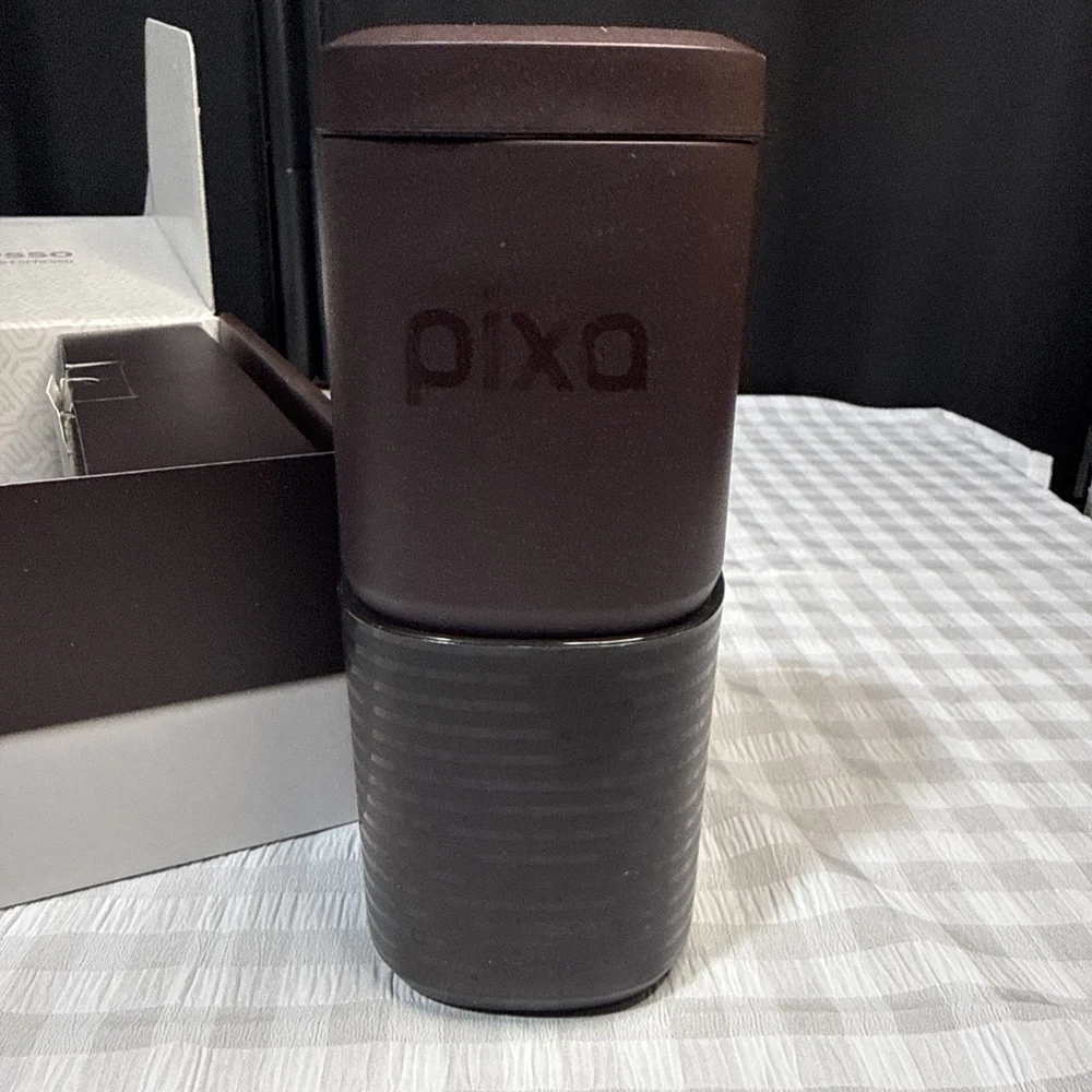 The PIXAPRESSO Coffee Machine is an electric and portable espresso machine that offers 4 different coffee types, including capsules and ground coffee. With a sleek dark burgundy design made of high-quality materials such as PP, PA6T, PBT, stainless steel, and silicone, this modern coffee maker from Wacaco is perfect for home or on-the-go use. It runs on 5V of power with a 100W motor, making it convenient to use anywhere with its reusable filter and included accessories like a funnel, carrying pouch, ground module, USB-C cable, capsule, and brush. Enjoy delicious espresso in style with the PIXAPRESSO Coffee Machine.