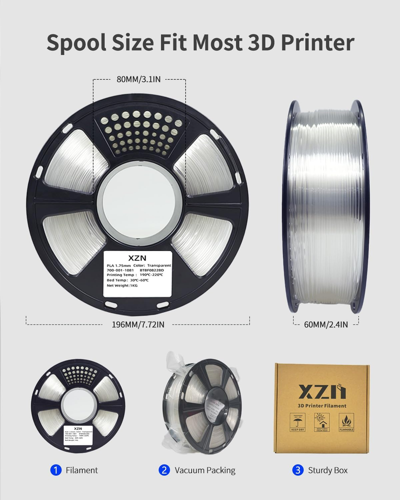 Store New Arrivals Add to Favorite View Feedback Contact PLA Filament 1.75Mm Clear, 3D Printer Filament 1Kg Spool (2.2Lbs), Neatly Wound, +/- 0.02Mm Precision, No Clog/Bubble, Excellent Layer Adhesion, Fits Most FDM Printers Description Unit Count 35.274 Ounce Material Polylactic Acid Number of Items 1 Color Clear Item Diameter 1.75 Millimeters Material Type Polylactic Acid Manufacturer Part Number -1081 Item Weight 2.7 pounds Package Dimensions 8.43 x 7.99 x 2.52 inches 【High Quality Transparent Filament】XZN clear pla filament is made of high quality material. Transparent pla is reliable, versatile and easy to use. No clogging, no bubbles, no tangles, and its excellent interlayer adhesion ensures high quality prints every time. 【High Accuracy】Minimum tolerance and low warping to ensure consistent feeding and stable prints, good layer bonding, less stringing, no bubbles, no cracking, no deformation, easy handling, resulting in an outstanding surface finish and are highly precise. 【Tangle Free & No Clogging】Total Length: 355m. Full 1KG 3D printer filament reel, perfect roundness and very tight diameter tolerance, good winding, does not overlap or tangle. Melt well, feed smoothly and constantly without clogging the nozzle or extruder. 【Vacuumed Sealed Packaging】XZN PLA filament use high-precision neat line arrangement, vacuum packaging and built-in desiccant, which can effectively prevent pla filament from moisture. 【Wide Compatibility】Compatible with most of FDM 3D Printers. Recommend pla filament extrusion / Nozzle temperature 190℃-220℃(374-428°F), hot bed 20℃-60℃(68-140°F). You are always the First for XZN. We are a team full of passions for 3D printing and strive to bring better printing experience for every customer Product description ABOUT US We offer the best prices around on high quality products. Our E-store includes media such as books, movies, music and games while offering electronics, toys, sporting apparel, clothing, tools, general home, garden items and more. SHIPPING We are always working hard to ensure your package arrives as soon as possible. Please understand that some factors like weather, high postal traffic, and the performance of shipping companies are outside of our control. We offer free shipping to the lower 48 states and ship within 2 business days of payment, usually sooner. We do not accept P.O. Boxes. Please provide a physical address. For shipping outside of the continental USA, we only use eBay's Global Shipping Program.The item is shipped to KY and then sent to the rest of the world. International customers are responsible for all duties and taxes. Continue to check out in order to calculate costs for shipping the item to your country. Messages regarding eBay's Global Shipping Program MUST be directed at eBay EXCLUSIVELY. RETURNS We offer a 30-Day Return Policy on items which you are not completely satisfied with. You have the option for a full-refund or an exchange of the item. No returns are available on items shipped outside of the USA. PAYMENT We accept PayPal. CONTACT US This page content is yet to come Please ad us to your favorite seller and visit again later Thank You CUSTOMER SATISFACTION We try our very best to make sure every customer is completely satisfied. If there's a problem, message us! We're happy to help. WE ACCEPT Copyright © 2021 AutoDS. | All Rights Reserved