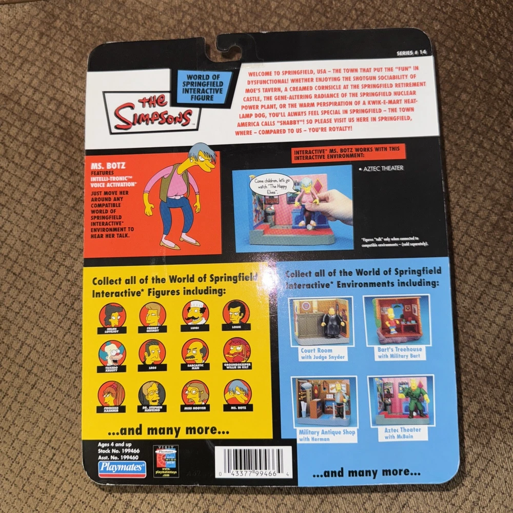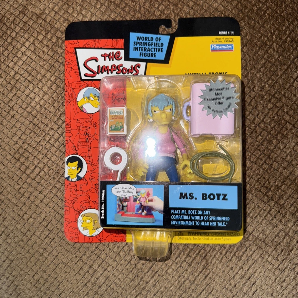 Material: Plastic MPN: N/A gtin13: 0043377994664 TV Show: The Simpsons Scale: 1:4 Series: 14 Featured Person/Artist: N/A Type: Action Figure Personalize: No Franchise: The World Of Springfield Theme: Cartoon & TV Character Country/Region of Manufacture: China Time Period Manufactured: 2000-2009 Movie: The Simpsons Character: Ms. Botz UPC: 0043377994664 Signed: No Vintage: Yes Year Manufactured: 2003 Convention/Event: N/A Brand: Playmates Toys Color: Multicolor Animation Studio: 20th Century Animation Model: N/A Original/Licensed Reproduction: Original