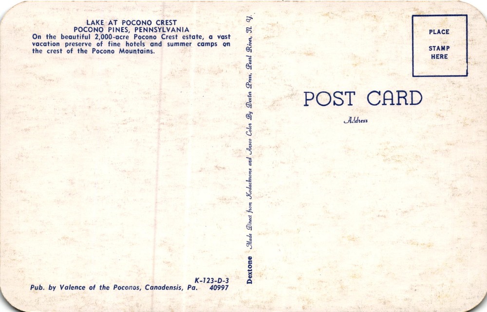 MAKE AN OFFER. THE MORE YOU BUY THE BETTER DEAL I WILL ACCEPT The postcard features a view of a lake at Pocono Crest in Pocono Pines, Pennsylvania. Pocono Crest is a 2,000-acre estate located on the crest of the Pocono Mountains. The estate is known for its fine hotels and summer camps, making it a popular vacation destination.