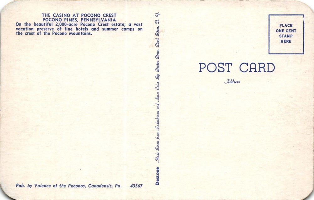 MAKE AN OFFER. THE MORE YOU BUY THE BETTER DEAL I WILL ACCEPT The postcard features The Casino at Pocono Crest in Pocono Pines, Pennsylvania. Pocono Crest is situated on a 2,000-acre estate in the Pocono Mountains, known for its fine hotels and summer camps.