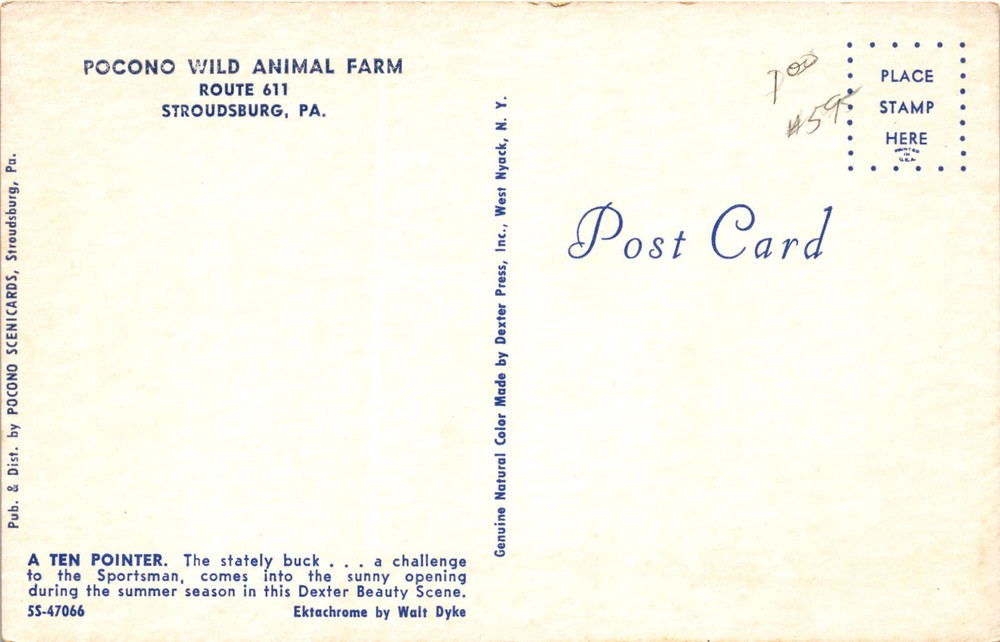 MAKE AN OFFER. THE MORE YOU BUY THE BETTER DEAL I WILL ACCEPT The postcard is a promotional material for the Pocono Wild Animal Farm located on Route 611 in Stroudsburg, Pennsylvania. The front of the postcard features an image of a ten-point buck, highlighting the wildlife that can be seen at the farm during the summer season.