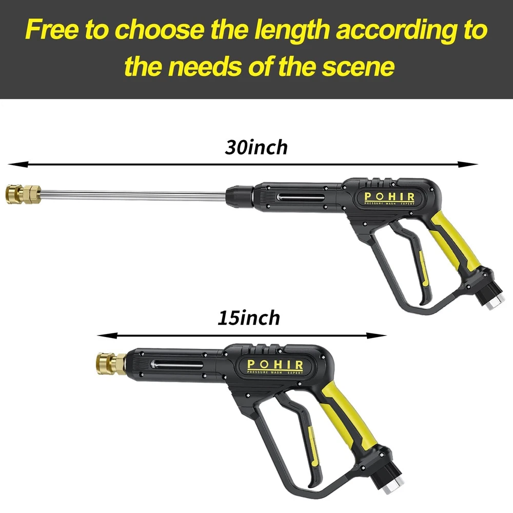 POHIR Pressure Washer Gun 3600 PSI with 3/8'' Swivel Quick Connect Extension Wand, M22 15mm and M22 14mm Fitting 30 Inch 7 Nozzle Tips, Yellow Product Details Material: Stainless Steel, Alloy Steel, Brass Brand: POHIR Item dimensions L x W x H: 3 x 2 x 1 inches Inlet Connection Type: Female Iron Pipe Number of Ports: 1 Valve Type: Ball Valve Manufacturer: POHIR Material: Stainless Steel, Alloy Steel, Brass Brand: POHIR Item dimensions L x W x H: 3 x 2 x 1 inches Inlet Connection Type: Female Iron Pipe Number of Ports: 1 Valve Type: Ball Valve Manufacturer: POHIR Part Number: pressure washer gun Item Weight: 2.5 pounds Product Dimensions: 3 x 2 x 1 inches Item model number: pressure washer gun Size: 3600PSI Gun Kit Color: Yellow Power Source: gas_powered Flow Rate: 8 Gallons Per Minute Hose Length: 1 Inches Batteries Included?: No Batteries Required?: No Date First Available: November 29, 2022 Premium pressure washer gun3600 PSI Max pressure, 8GPM Max Flow. Max temperature of water is rated to 60C / 140 F. With M22-14 and M22-15 fittings and 3/8'' connector for direct connection to 14mm or 15mm or 3/8'' inner diameter pressure hose fittings Compatible pressure washerWith different fittings like M22 14mm fitting,is compatible with Simpson, CraftsmanBriggs Stratton,Karcher, Ryobi pressure washer. M22 15mm fitting is compatible with Sun Joe, Campbell, MI-T-M, AR Blue, Stanley, Cleanforce, Simoniz power washer.Replacement short pressure washer gun fits gas and electric pressure washer with M22 fitting. 16 inch Extension WandThis wand make the total length of the gun 30 inches(If you need to connect the extension wand, please use a wrench to remove the 1/4 quick connector on the gun head). 1/4''standard quick connectorCan be used with any accessory with a 1/4'' plug. Such as nozzles tips, foam cannon, water broom, pivoting coupler, undercarriage cleaner, surface cleaner. Comfortable handle design for easy handling. Package include 1 x 3600psi pressure washer gun,1 x Extension wand,1 x M22 14mm conver fitting, 1 x M22 15mm conver fitting,1 x 3/8" quick connect fitting, 1 x pressure washer nozzle holder, 7 x pressure washer nozzles with different spray angle,Choose different nozzle according to your needs.