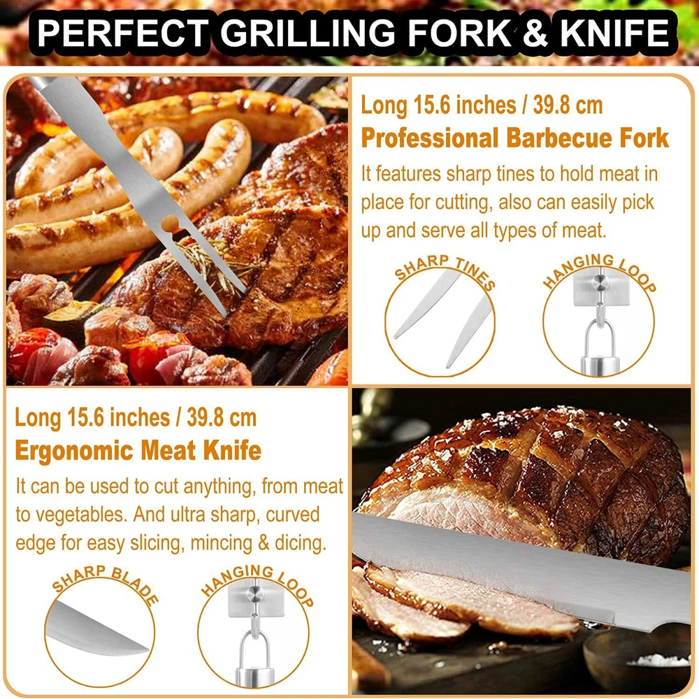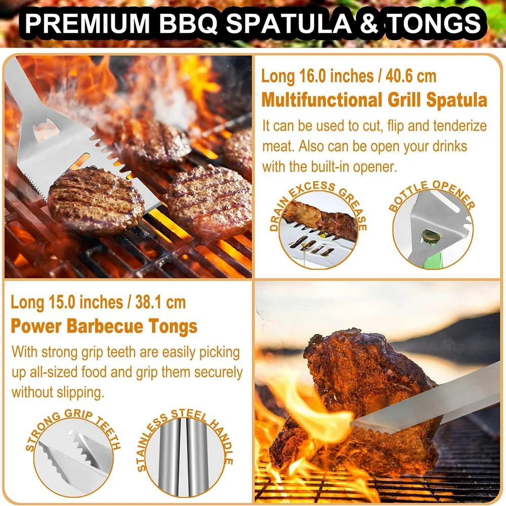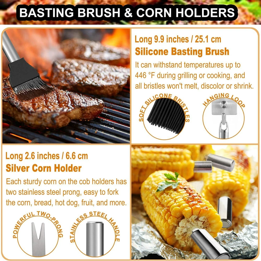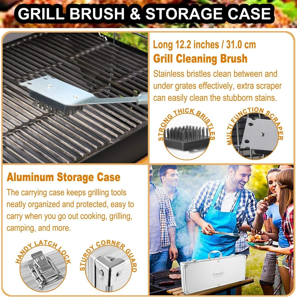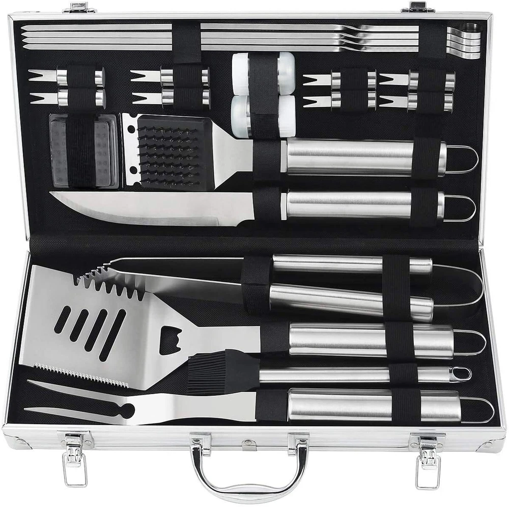 POLIGO 22pc BBQ Accessories Stainless Steel BBQ Grill Tools Set for Christmas Birthday Gifts - Premium Barbecue Grill Utensil Set in Aluminum Case - Perfect Grilling Present Kit for Men Women Bottom of Form · COMPLETE GRILL ACCESSORIES KIT - The 22 piece barbecue utensils set includes 4-in-1 barbecue spatula, grill tong, BBQ fork, meat knife, 4 skewers, 8 corn holders, silicone basting brush, grill cleaning brush, salt & pepper shakers, replaceable head of grill brush and aluminum storage case. · PREMIUM QUALITY - The grilling tools are made of professional grade stainless steel, making this barbecue tool set durable and long-lasting, easy to clean and dishwasher safe. · USER-FRIENDLY DESIGN - Elongated handles keep your hands safe from the heat. Hanging ring design enables easy storage during the off-use. All grill utensil sets are stored in portable and convenient case. · ALUMINUM STORAGE CASE - Keep all barbecue utensils stay in order and protected in the lightweight case when you storage or you go. Also it will be an excellent choice for gift set. The high quality grill utensils set kit is an ideal choice for the groomsmen, foodies, barbecue fans, cooks, camping lovers.