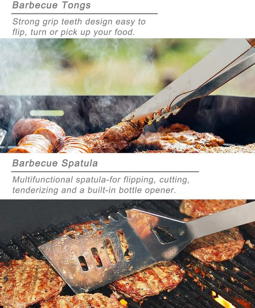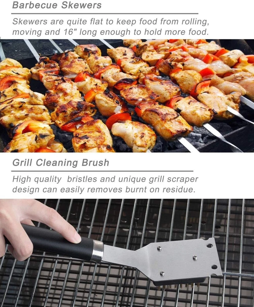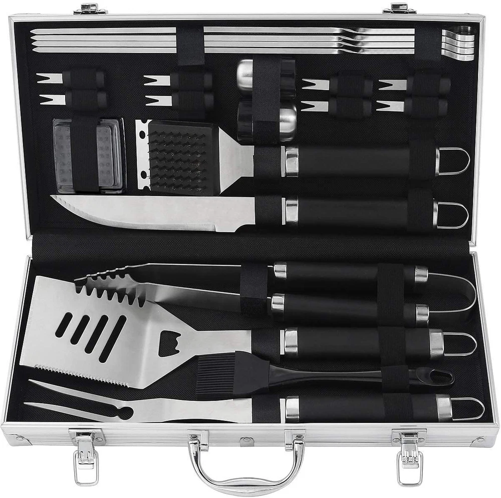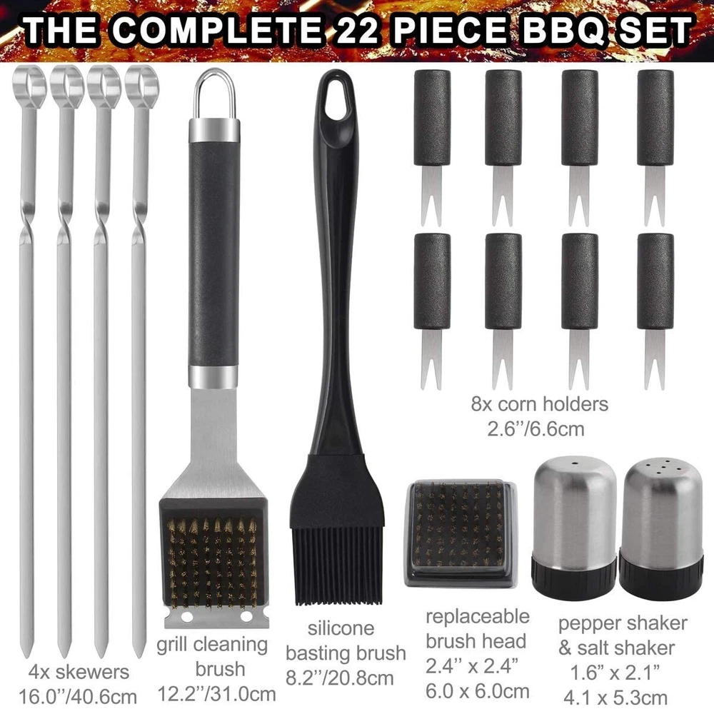 POLIGO 22pc BBQ Accessories Stainless Steel BBQ Grill Tool Set for Christmas Birthday Gifts - Premium Barbecue Grill Utensil Set in Aluminum Case - Perfect Grilling Present Kit for Men Women Bottom of Form · COMPLETE GRILL ACCESSORIES KIT - The 22 piece barbecue utensils set includes 4-in-1 barbecue spatula, grill tong, BBQ fork, meat knife, 4 skewers, 8 corn holders, silicone basting brush, grill cleaning brush, salt & pepper shakers, replaceable head of grill brush and aluminum storage case. · PREMIUM QUALITY - The grilling tools are made of professional grade stainless steel, making this barbecue tool set durable and long-lasting, easy to clean and dishwasher safe. · USER-FRIENDLY DESIGN - Elongated and heat resistant handles keep your hands safe from the heat. Hanging ring design enables easy storage during the off-use. All grill utensil sets are stored in portable and convenient case. · ALUMINUM STORAGE CASE - Keep all barbecue utensils stay in order and protected in the lightweight case when you storage or you go. Also it will be an excellent choice for gift set. The high quality grill utensils set kit is an ideal choice for the groomsmen, foodies, barbecue fans, cooks, camping lovers.