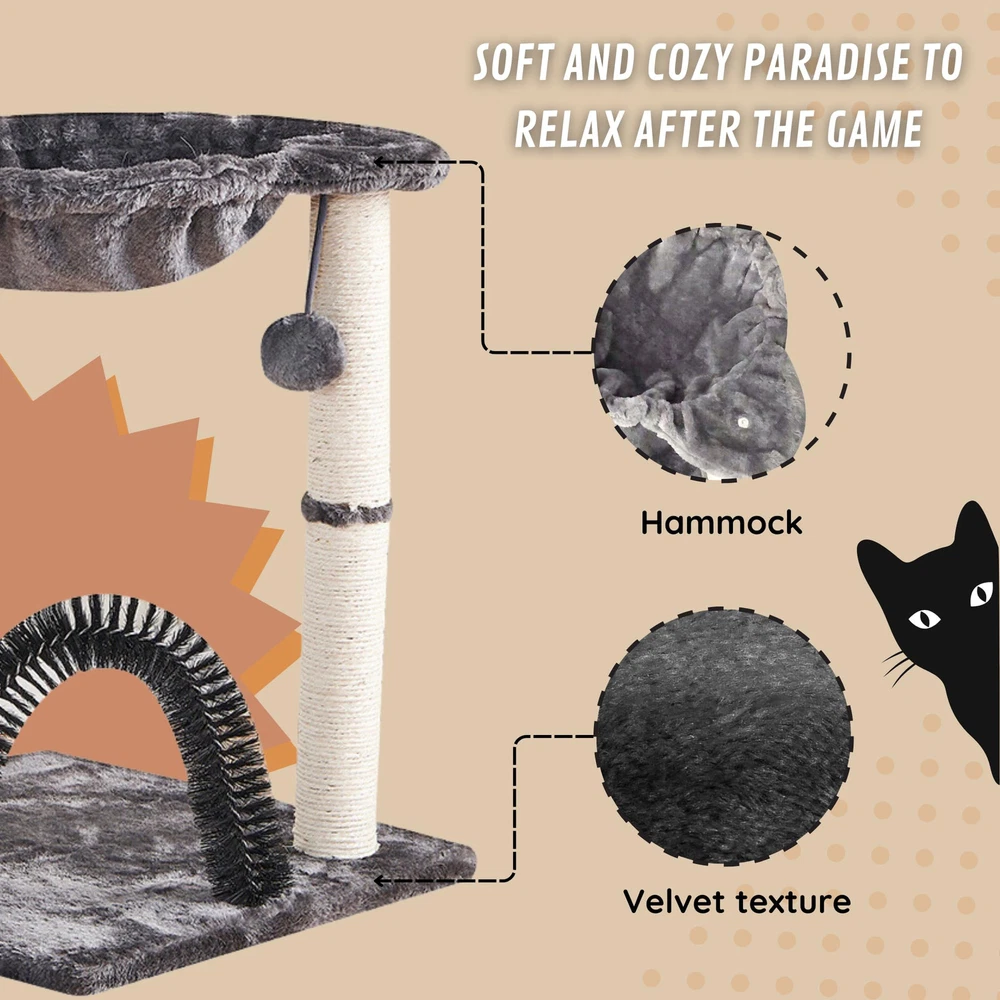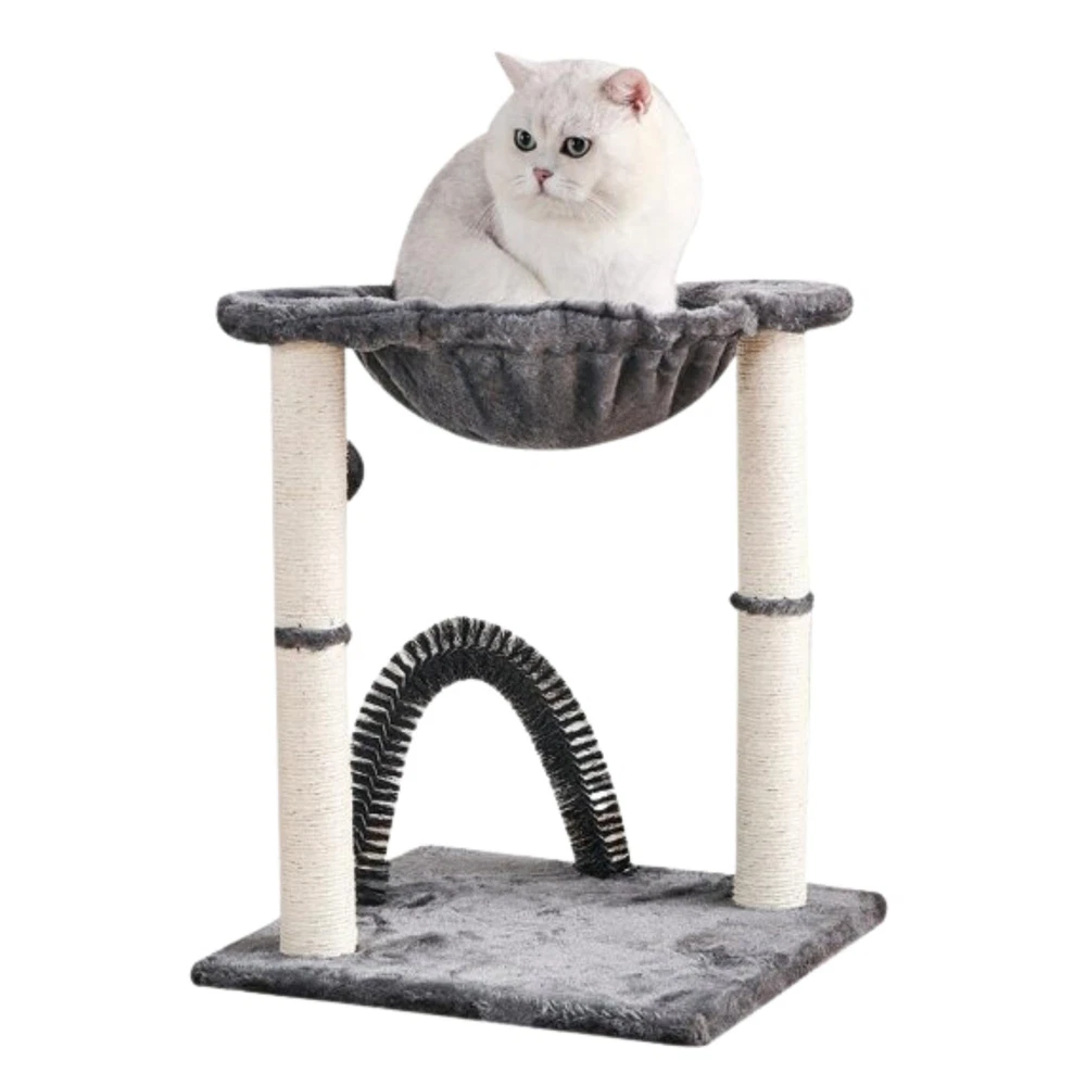 1. recommendation for small breeds 2. Gray cat tower designed for indoor cats to climb, scratch and enjoy a cozy nap 3. SCRATCHING POST: Features 2 cat scratching posts are wrapped in sisal fiber, which has the rough texture, similar to tree bark, to better meet your cat's scratching needs; Sisal is also strong, durable and economical. Redirect cats from scratching carpets or home furniture. 4. COZY SURFACE: The hammock is lined with soft faux fur fabric that is gentle on the nose and paws for added snuggling comfort. 5. SIMPLE ASSEMBLY; It comes with instructions to guide you step by step and an informative video so that assembly is not difficult for you." Material: Sisal, particle board, plush Product measurements: 40x40x50cm Net weight single box: 3.6kg Individual box Gross Weight: 5.5kg Individual box measurements: 41*41*11cm CAT TOWER FOR INDOOR CATS - This compact cat tree features a neutral color scheme that complements any home décor. Its vertical design and small footprint take up minimal floor space, making it an ideal addition to your cat accessories. Also comes with an exclusive self-massager for cats that will bring happiness to your furry friend. SCRATCHRESISTANT POST - The cat furniture includes 19-inch-tall sisal rope cat scratching posts for indoor cats. These posts aid in the protection of your furniture and carpeting, as well as support healthy claws for your feline. HOURS OF ENTERTAINMENT - This cat scratcher contains a dangling toy that stimulates your cat’s senses and innate instincts. Your kitty will spend hours playing with the ball toy that hangs from the cat scratching post also had included a self massager than helps the cat with the COZY AND STURDY - This charming cat tree boasts a plush, polyester cat bed raised above a 16 inch square base covered in carpeting. It can be effortlessly assembled in minutes and is sturdy enough for use by both large adult cats and kittens.