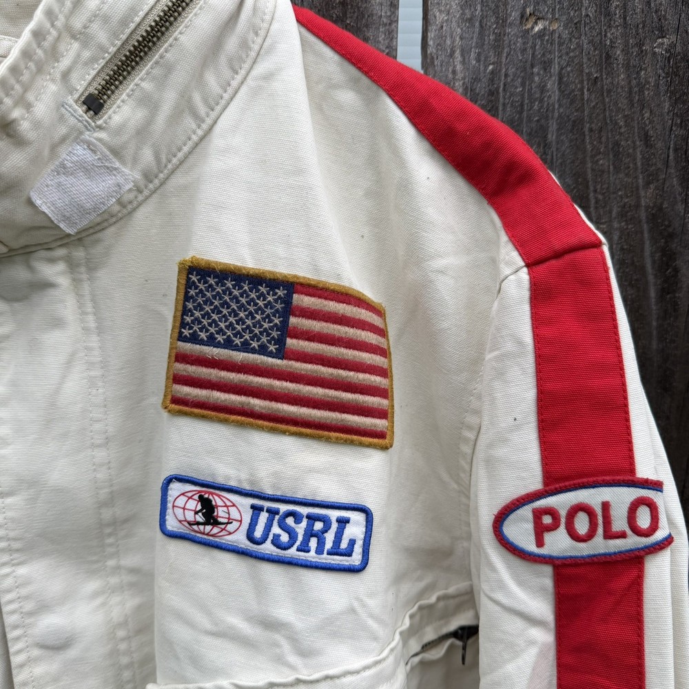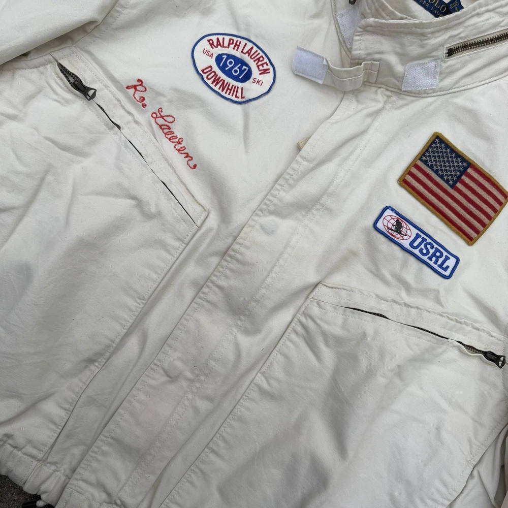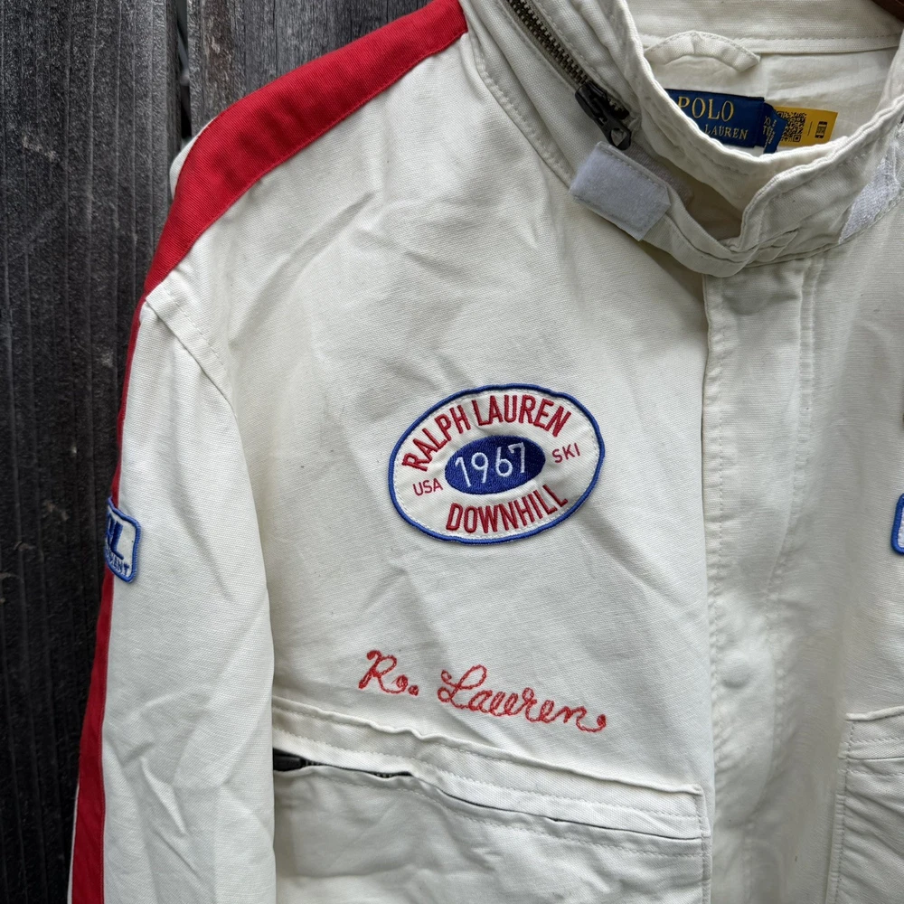 Authentic Polo Ralph Lauren “1967 Downhill Ski” racing jacket, an archive-inspired piece drawing from vintage alpine and motorsport uniforms. Features bold embroidered patches, signature red racing stripes, and classic Polo utility construction. This is a true Polo archive-style jacket with strong collector appeal. Original hang tags are still attached; however, this item is NOT brand new and shows signs of prior handling/storage. • “Ralph Lauren 1967 Downhill Ski” embroidered chest patch • Embroidered U.S. flag and USRL patches • Red racing stripes down sleeves • “Polo” sleeve patch • Script “R. Lauren” embroidery • Zip chest pockets • Ribbed cuffs • Adjustable drawcord hem • High collar with closure tabs ⸻ SIZE Tagged size: Men’s XXL ⸻ CONDITION (PLEASE READ) Pre-owned / vintage condition. Tags attached but NOT brand new. • Visible wrinkling throughout from wear or long-term storage • Light marks and minor discoloration visible in areas (see close-up photos) • Fabric, patches, embroidery, and structure remain solid • No major tears, holes, or missing components This piece has clearly been handled or worn, despite retaining original tags. Condition is consistent with an older collectible Polo jacket rather than a deadstock item. ⸻ AUTHENTICITY 100% authentic Polo Ralph Lauren. Original labels, patches, and construction consistent with genuine archive Polo outerwear. • Vintage item sold as-is • No returns due to fit or condition • Please review all photos carefully before purchase